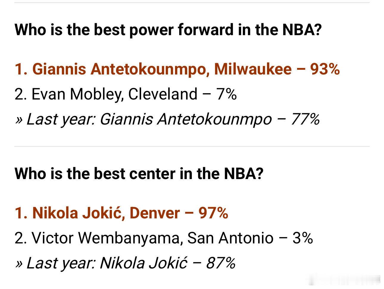 NBA总经理投票选出每个位置的最佳球员: