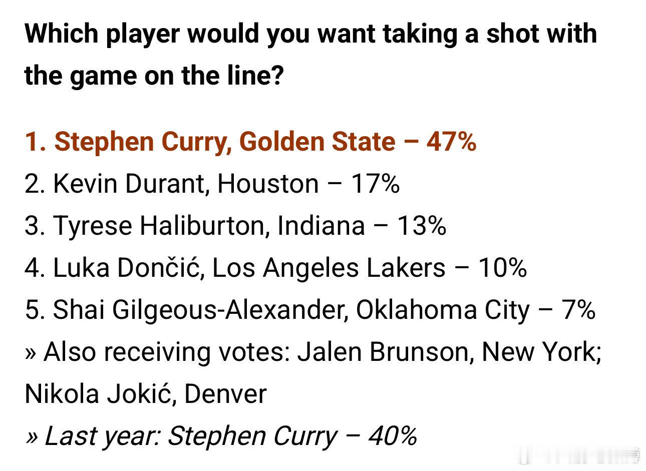 NBA总经理们投票选出他们希望在比赛关键时刻投篮的球员。
