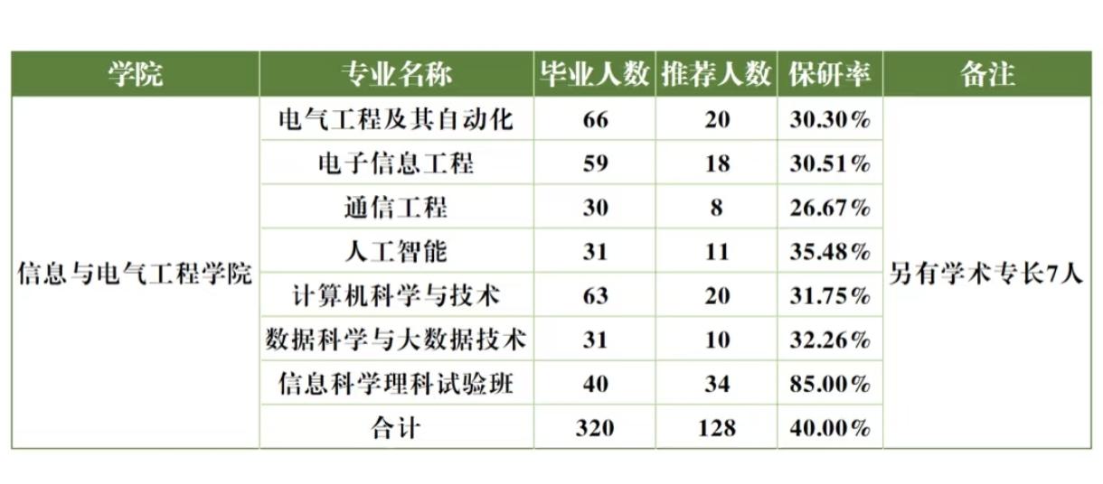 40%的保研率!中国农业大学信电学院2026届保研率确实突破了很多人的想象,不愧是985高校,够牛。 中国农业大学信息与电气工程学院是一个比较大的工科学院,也算热门。本科专业有不少,包括电气工程及其自动化、电子信息工程、通信工程、人工智能、计算机科学与技术、数据科学与大数据技术和信息科学理科试验班。 各专业毕业人数不等,电气工程及其自动化比较多,有66人;通信工程少一点,只有30人;保研推荐人数最多的是信息科学理科试验班,34人;少的只有8人。 保研率差异明显,信息科学理科试验班保研率高达85.00%,通信工程为26.67%,算上学术专长7人,学院整体保研人数128人,保研率率为40.00%,不低了。 农大信电学院2025届各专业保研率又是怎样的呢? - 信息科学理科试验班:保研率为70%,该专业有43人,推荐保研人数为35人。 - 电气工程及其自动化:保研率约为27.7%,专业人数为65人,推荐保研人数为18人。 - 电子信息工程:保研率约28.6%,专业人数63人,推荐保研人数18人。 - 通信工程:保研率为30%,专业人数30人,推荐保研人数9人。 - 人工智能:保研率约为27.8%,专业人数36人,推荐保研人数10人。 - 数据科学与大数据技术:保研率约29.7%,专业人数37人,推荐保研人数11人。 - 计算机科学与技术:保研率约为28%,专业人数75人,推荐保研人数21人。 看出来没,今年的保研率升高了,这也是多数高校的一个趋势。 个人认为,中国农业大学具有性价比,主要因为: 1,升学优势:保研率高(如信电学院整体40%,其他涉农学院保研率更高),深造机会多。 2,分数合理不算高:同层次985中录取分数线更适中,能以相对较低分数进入名校。 3,学科实力:作为985、双一流高校,学科有特色且实力强,就业和学术认可度高。选调有优势,进大厂也不会卡简历。 总的而言,农大是不错的学校。未来,农大还与英国萨里大学开办三个中外合作办学本科专业,都上热门的信息类专业,就看你忌讳不忌讳农业这两个字了。