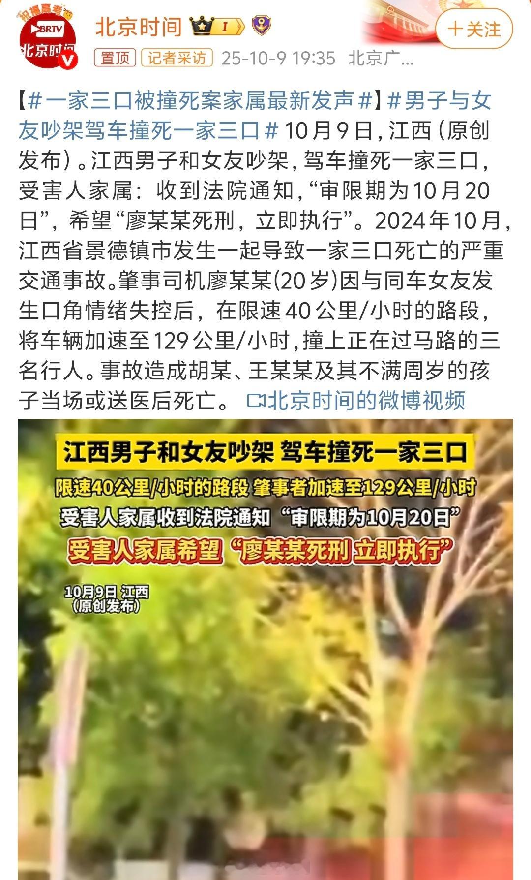 这是去年国庆震惊全国的景德镇事故了,吵架导致加速撞死一家三口,家属希望判处死刑,立即执行。