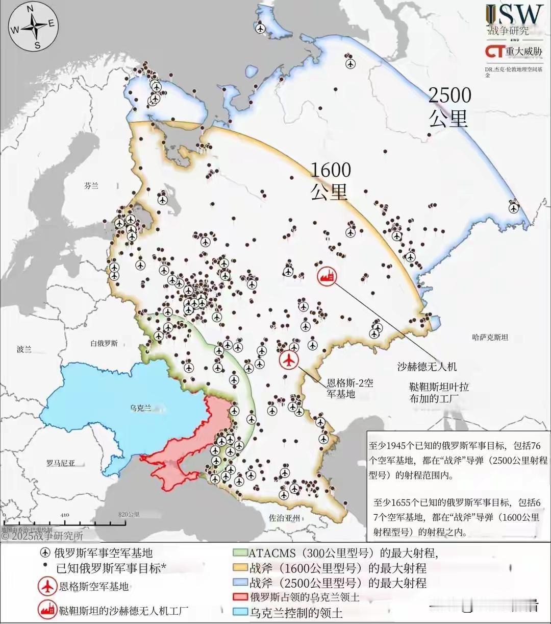 “战斧”式巡航导弹,能打击俄罗斯纵深的哪些目标? 美国战争研究所绘制的示意图,从这张打击范围图可见,2500公里射程的战斧导弹可覆盖俄境内至少1945个军事目标,包括76个空军基地及沙赫德无人机工厂等关键设施,理论上能威胁俄工业区与能源体系。 但实战中其威慑力仍有限:一方面,美方受成本与欧洲态度制约,难大规模交付;另一方面,俄会强化S-400等防空系统,并通过分散布局、备用设施削弱打击实效。且特朗普援乌更多是讹诈手段,乌克兰即便获得也因俄方反制升级(如打击乌领导层、核力量演示)不敢轻易动用。 归根结底,单一武器的射程优势难突破双方战略平衡,战斧最多是地缘博弈的筹码,无法真正左右俄乌战局走向。