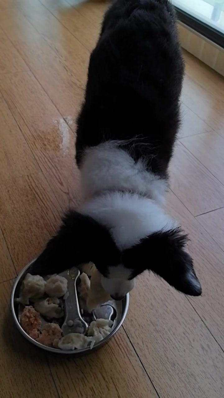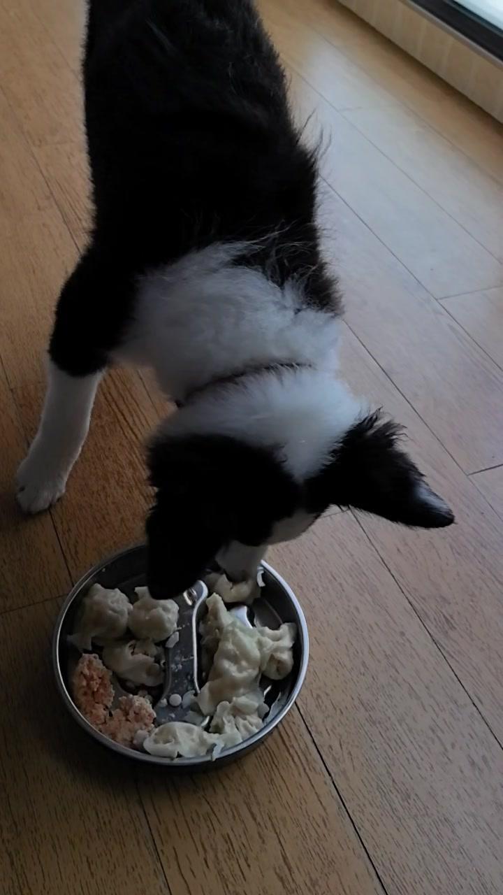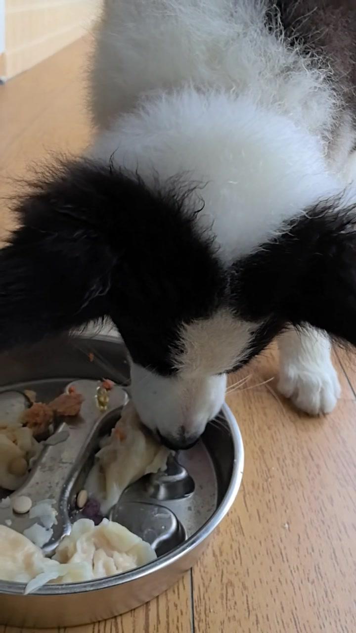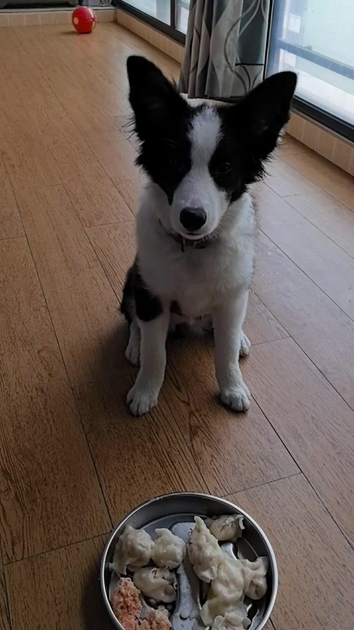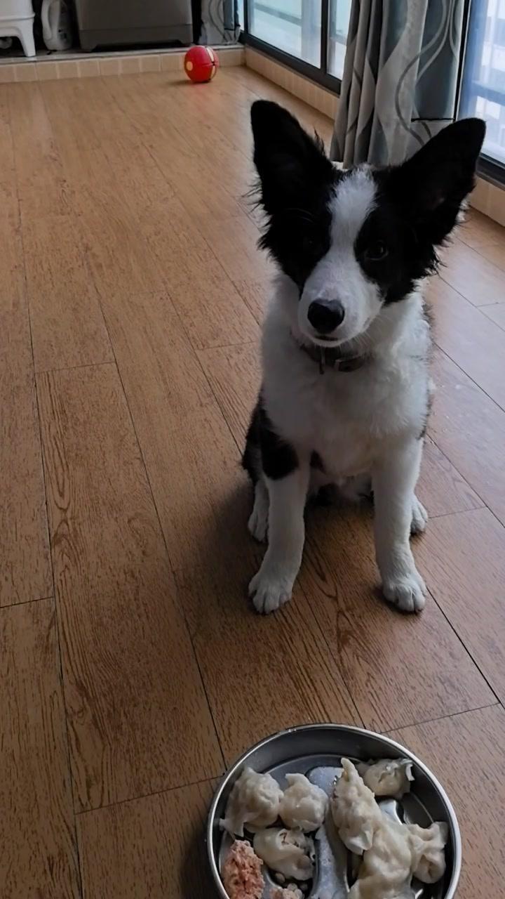 给边牧途途包了鸡肉胡萝卜馅饺子,看它吃得狼吞虎咽,一口一个,真是又可爱又让人着急