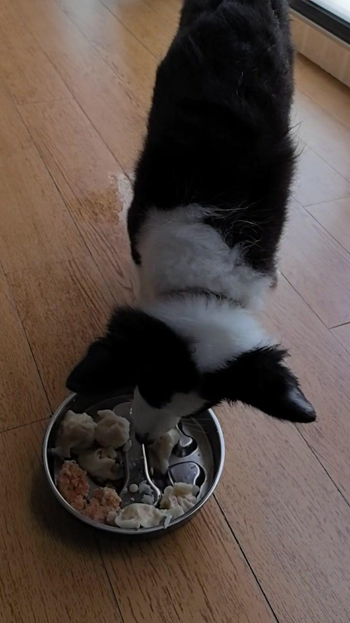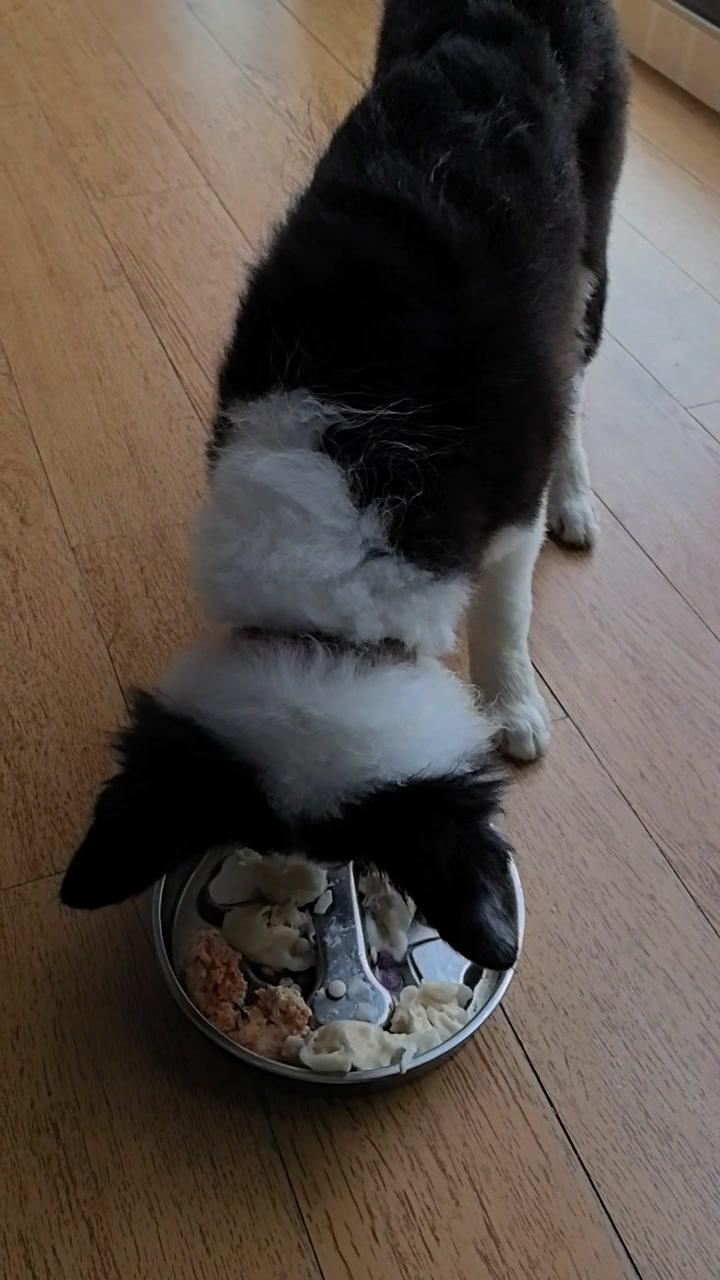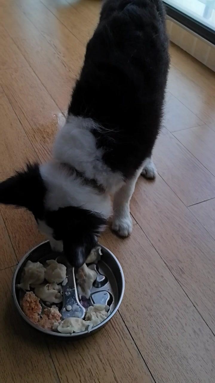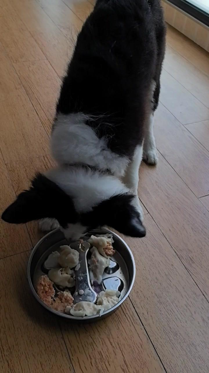 给边牧途途包了鸡肉胡萝卜馅饺子,看它吃得狼吞虎咽,一口一个,真是又可爱又让人着急。 其实我也遇到过同样的问题,像之前喂零食,它总是三下五除二就吃完了,根本来不及反应。后来我发现可以用一些小方法,比如把食物放在漏食玩具里,或者用慢食碗,让它吃起来更费劲一点,这样既能放慢速度,还能增加互动。 你家毛孩子吃饭快吗?都是怎么让它们放慢速度的呀?