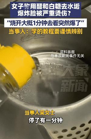 “万万没想到!”近日,河北邯郸一女子用醋和白糖去水垢爆炸脸被严重烫伤一事引起关注。当事人直呼“学的教程要谨慎辨别”。 吴女士看自家水壶的水垢太多了。便从网上看到了很多去水垢的“小妙招”。吴女士看到醋和白糖可以去水垢,想着家里面正好有这些东西。 于是就用醋和白糖加进水壶里烧开。等待1分钟后去查看,万万没想到它竟然爆炸了。那些烧开的水一下子被炸到脸上导致脸烫伤。 此事也引起了网友们的热议,网友说:“不是直接煮白醋吗?怎么还加糖?是不是又听了一些邪修。她应该没有说实话。” 还有网友说:“白糖加醋怎么会爆炸呢?很多菜不都是白糖加醋做的吗?也没爆炸啊!” 也有网友说:“买一个新鲜的黄柠檬🍋,切开放在水壶里面烧开,过半个小时水垢就吊下来了。” 看专家解释说,白醋和白糖混合后会改变水的沸点,密闭的保温壶内部气压升高,热液体瞬间“爆沸”喷射。 不得不说,“小妙招”有的时候管用,有的时候还真的要多加小心。很多既没科学依据又存在安全隐患。除水垢最安全的办法是用专用除垢剂。千万别自己乱混胡用,不然就像吴女士这样得不偿失了。 你会相信小妙招吗?对此事你怎么看?万能生活指南 (信息来源:大象新闻)