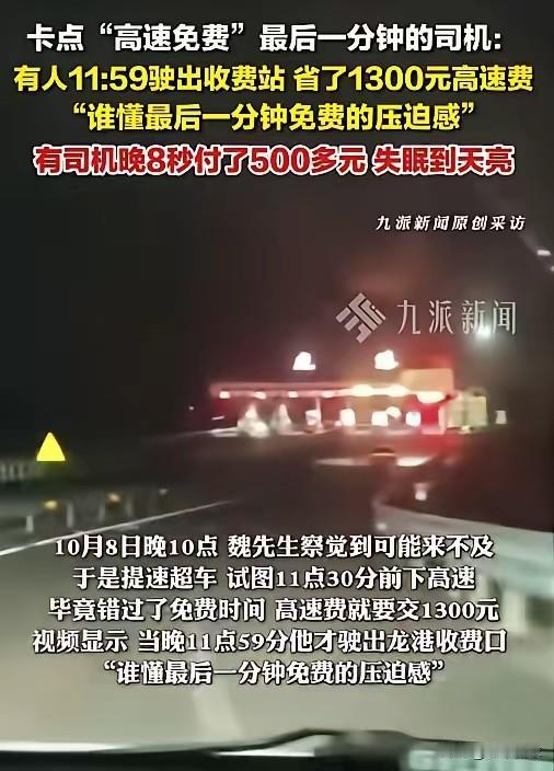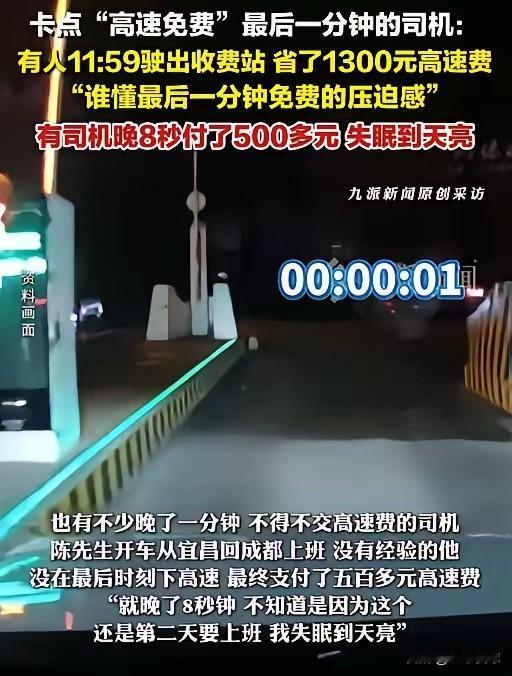 8秒500元背后的规则,必须坚决执行!自从实行了假期高速费免费之后,每年都有这样的事情发生。这就像高考迟到30分钟,不能进入考场一样。 有人说,应该放行,8秒钟,又不是什么大问题!可是放了8秒,就会有1分钟,5分钟,10分钟的同样情况出现! 规则就是规则,很多人现在没有规则意识。小问题逐渐要变成大漏洞。如果这样,自己不把时间卡的这么死,是不是好点? 按照他说的,预计11点半到家。如果选择10点到,好好休息,第二天上班就没有这个问题了。为什么选择这么晚哪?并且,自己也说了,春节也差点出现问题。看来这不是第一次了,经验老道了! 一边是工作人员的人性化催,一边是驾乘人员的专业化卡,这个难题怎么解?无解? 如果大家都预留多那么一点点,一切就都好了!