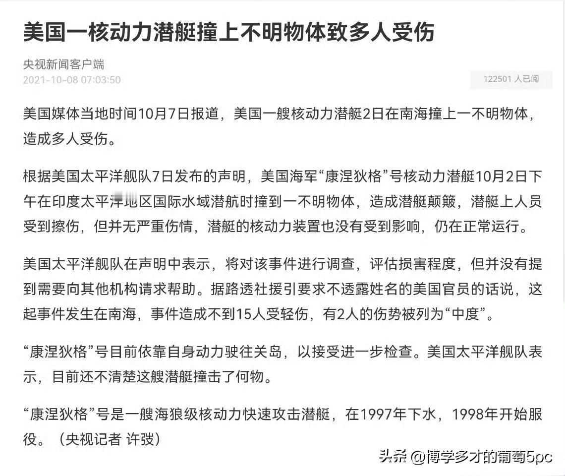 撞了8个月都没修的杜鲁门号航母不算离谱,撞了4年多的核潜艇康涅狄格号到现在也还没修,帝国工业衰落程度可见一斑。三十年前的美国要是看到今天的美国,一定会怒而起兵光复美国,make america great again。 四年前,2021年10月2日,美国海狼级核潜艇“康涅狄格”号在南海海域意外撞山。彼时事故并不算严重:仅艇首受损,15名水兵受伤,潜艇主体结构完好,还能依靠自身动力上浮航行,最终顺利返回港口等待维修。 可谁也没想到,这场“小修小补”竟成了漫长的等待。光是排队等待进厂大修,就耗去整整两年时间;好不容易盼到入厂,又陷入“三无”困境——配件短缺、工人短缺、资金短缺,核心维修资源样样缺位,关键部件造不出来,维修工作根本无从推进。 4年过去了,这艘艇修几乎没修。 于是这艘潜艇现在还是被撞时的惨样,处于头秃状态。原计划2025年修复,现在毫不意外的延期到2026年。即便到了2026年,能否顺利修好仍是未知数。要想能修好,也只能等中援。 这艘如今修了四年都没进展的核潜艇,当年建造仅用了两年。三十年前能“两年建成”的军工重器,如今连“四年修好”都成了奢望,美国工业的全方位衰落,早已不是纸上谈兵。
