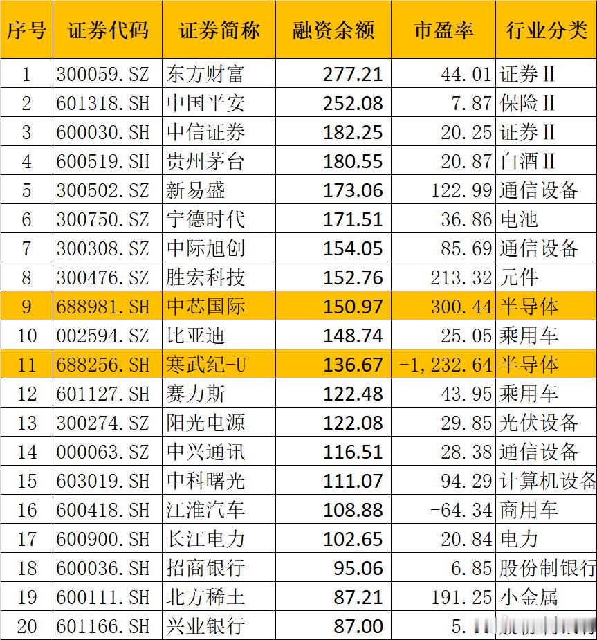 中芯国际融资余额为151亿,排名第九。
