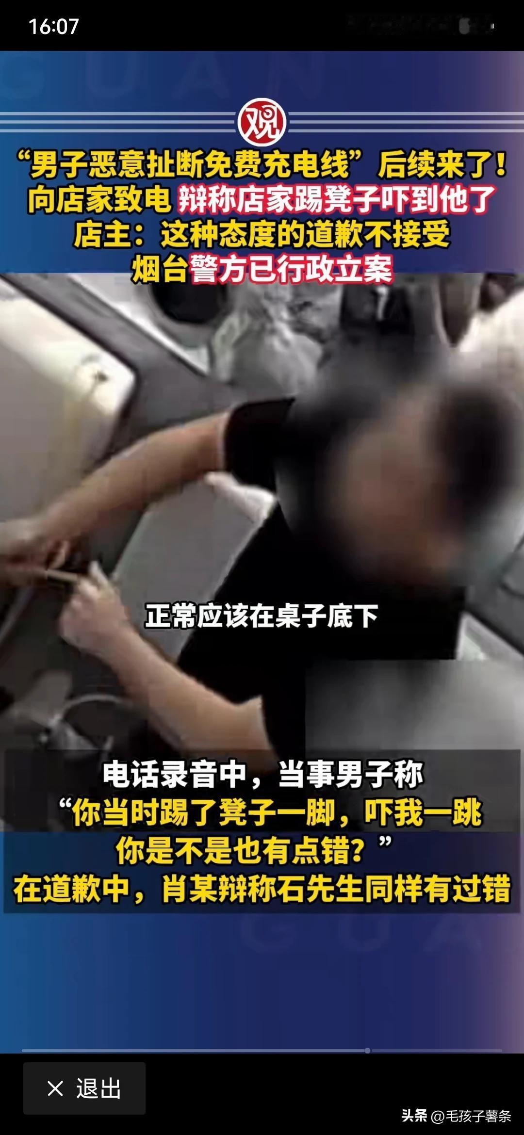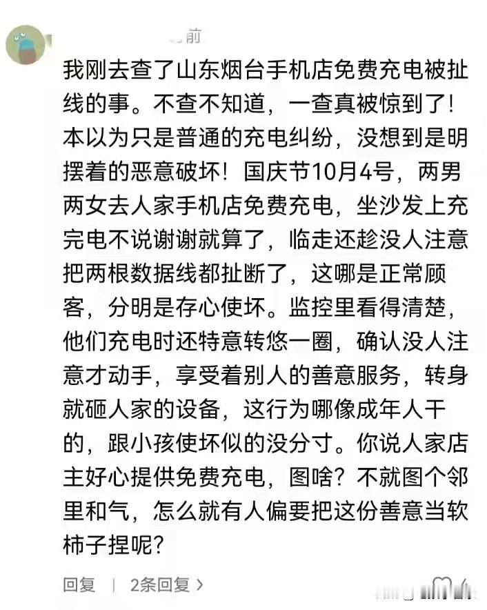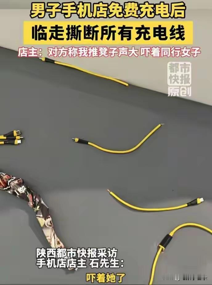 出门在外就怕手机没电了,遇到好心的店家免费给充电,还坐在店家的沙发上,走的时候怎么的也能说声谢谢吧,可是就有这样的人,不仅不领情不道谢,还昧着良心做亏心事,充完电不仅没有对店家表示感谢,还把店家提供的免费的数据线给扯断了,节操碎了一地。 四个人两男两女结伴同行,途中来到一个店里,享受免费的手机充电,本应该是一个温馨和谐的画面,就在四个人充完电后即将离开的时候,发生了一件让人难以置信的事情,其中一个穿黑衣服的男子,临走时把充电器撕碎扯烂,然后扬长而去。 看黑衣男子气急败坏地样子,不知道的还以为店家收了他钱或者不让他充电呢,其实店家让他们一行四人免费充电,还提供了舒适的沙发,他们四个人坐在舒服啊沙发上,享受着免费的充电服务,走的时候竟然把充电线给扯碎。 现在都是网络世界,他们无论走到哪里都会找到他们,充电数据线不贵,可是人的尊严高于一切,店家现在不需要黑衣男子赔偿,而是需要黑衣男子的一个诚挚的道歉。 图自网络侵必删
