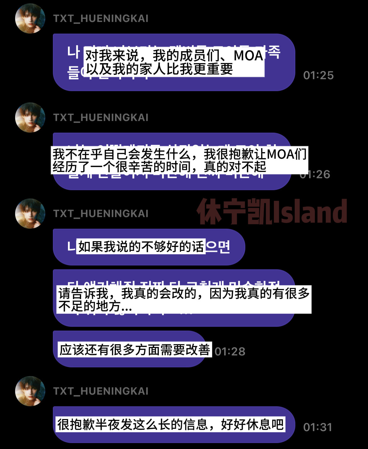 休宁凯道歉休宁凯回应深夜和女生喝酒 近日,TXT成员休宁凯被拍到在首尔狎鸥亭酒吧与一名女性饮酒至凌晨并一起乘车离开,引发热议。10日凌晨,休宁凯在粉丝平台发文回应,称该女生是认识的朋友,“在那种情况下不能让她一个人呆着,所以我把她送回去就送回宿舍了”,并在文中向粉丝、成员及公司道歉,表示现在更想专注于工作。