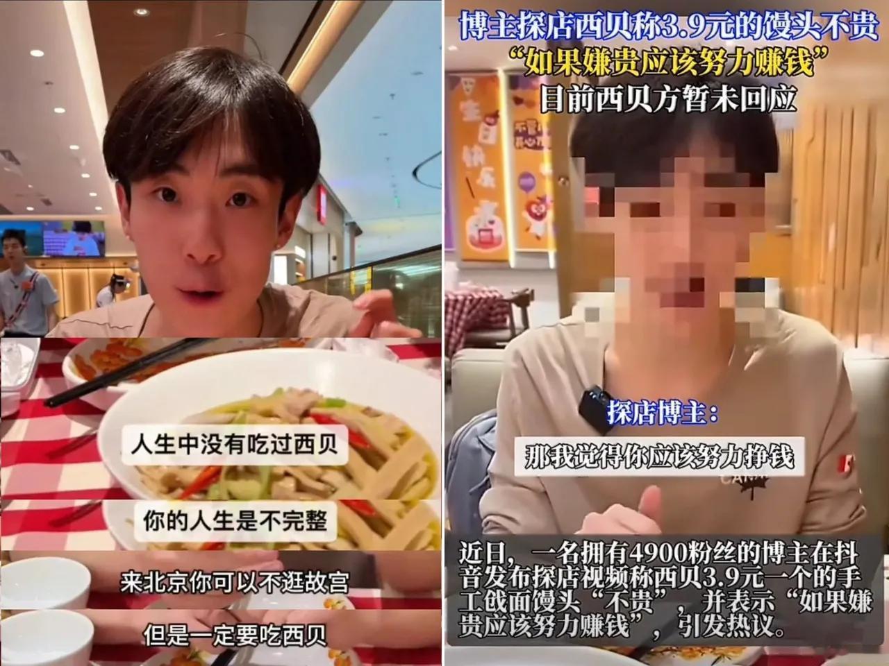 国庆刚结束,贾国龙又挨一刀, 邀请网红来探店,吃了3.9的馒头, 结果一句“嫌贵应该努力赚钱”,让西贝雪上加霜。 近日,一个5000粉丝的博主,去探店西贝旗舰店, 为了赚160块宣传费,就敢昧着良心,把所有人得罪了。 网友评论: 从出事以来,贾总自己给自己一刀又一刀,当你以为他要转变态度时,他一刀又一刀又一刀……就前无古人后无来者。 没有人会请5000粉丝的博主去探店的,绝大多数的可能是那个博主凑西贝的热度炒作自己,只要你们搭理他,他就成功了。现在看来他的目的差不多达到了。 以前有个瘫痪多年有痴呆了一位爷爷,有一天他儿子带他外出旅游,去西贝吃了一餐饭,你们知道后来怎么样了?结果行走自如,也不痴呆了,就是这么神奇,后来上解密也没解释出来,真的就是这么好。