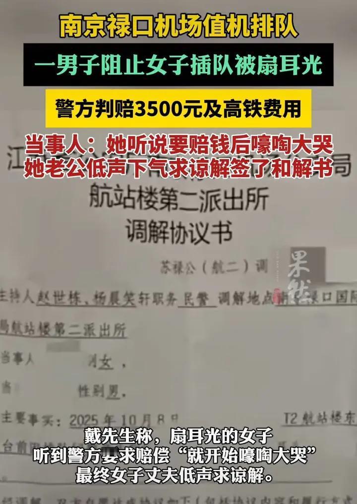 南京机场一乘客因阻止插队被扇耳光,当事人称对方已道歉,并补偿3500元 10月8日国庆返程高峰,南京禄口机场值机大厅的长龙里,一场因插队引发的冲突让全网炸了锅。 戴先生正耐心排队时,一家四口径直往队伍缝隙里钻,周围乘客纷纷侧目,却没人敢出声。 “插队是不对的”,戴先生的提醒没能换来歉意,反倒点燃了对方的火气。 女子的父亲率先用行李箱撞向戴先生的箱子,磕得他脚腕生疼。 没等戴先生反应,一家四口已经围了上来,脏话辱骂声此起彼伏,身材壮硕的女子突然动手,两记耳光直接将戴先生扇倒在地。 现场视频里,原本有序的队伍乱作一团,有乘客掏出手机记录,却没人敢上前劝阻。 更讽刺的是,当戴先生报警,双方被带到派出所后,这家人的态度来了个180度大转弯。 起初还辩解“赶飞机着急”“父亲患癌症情绪差”,可当民警拿出调解书,明确要赔偿3500元医疗费和530元高铁改签费时,打人女子突然嚎啕大哭,丈夫也立刻换上卑微脸色,反复恳求戴先生谅解签字。 让戴先生更气愤的是,他按对方要求删除视频后,女子竟当场骂骂咧咧,直言“这点钱算什么”。 这番操作彻底惹恼了戴先生,他咨询律师后重新曝光了事件,“不是为了钱,是这种人不该被轻易原谅”。 事件发酵后,评论区里满是网友的怒火。 有人算过一笔账:“两耳光3500元,平均一耳光1750元,这代价也太低了”,更有人质疑“花钱就能摆平暴力,以后谁还敢管闲事”。 不少人分享了自己的经历:超市里提醒插队被瞪、地铁上制止抢座遭辱骂,久而久之大家都学会了“睁一只眼闭一只眼”。 还有网友把矛头指向机场工作人员,当时有乘客曾找地勤求助,得到的回应却是“忙着业务走不开,建议报警”。 大家不解:“维护秩序本是他们的职责,要是早有人制止,何至于闹到动手”。 这并非个例,上个月湖北宜昌,13岁男孩制止超市插队被猛踹。 几年前广州白云机场,出租车司机因插队纠纷用扳手伤人被刑拘。 这些案例都在说明:插队看似小事,实则是对公共规则的践踏,暴力对抗更是踩了法律红线。 涉事家庭口中的“赶时间”“家人患病”,从来不是插队打人的借口。 国庆返程高峰,机场里谁不着急?可正是“排队等候”这样的小事,才撑得起公共空间的秩序,就像网友说的:“文明从不是高要求,只是做人的基本底线”。 这场闹剧最终以赔偿收场,但留下的思考远没结束。 为什么插队行为屡禁不止?为什么有人敢动手打人?根源或许在于“犯错成本太低”觉得插队能省时间,觉得动手赔钱就能了事。 可他们忘了,规矩面前没有“特殊情况”,一时的嚣张只会换来更丢人的结局。 其实遇到插队,有更稳妥的解决办法,找工作人员介入、用手机记录证据、及时报警,没必要硬碰硬。 而对那些想走“捷径”的人来说,该明白:排队守序不是吃亏,而是对所有人的尊重,赔钱道歉不是结束,而是为自己的任性买单。 机场的队伍要排,人生的规矩更要守,这家人从嚣张到哭穷的转变,恰恰印证了“有理走遍天下,无理寸步难行”。毕竟体面从不是耍横换来的,守规矩才是最踏实的“通行证”。