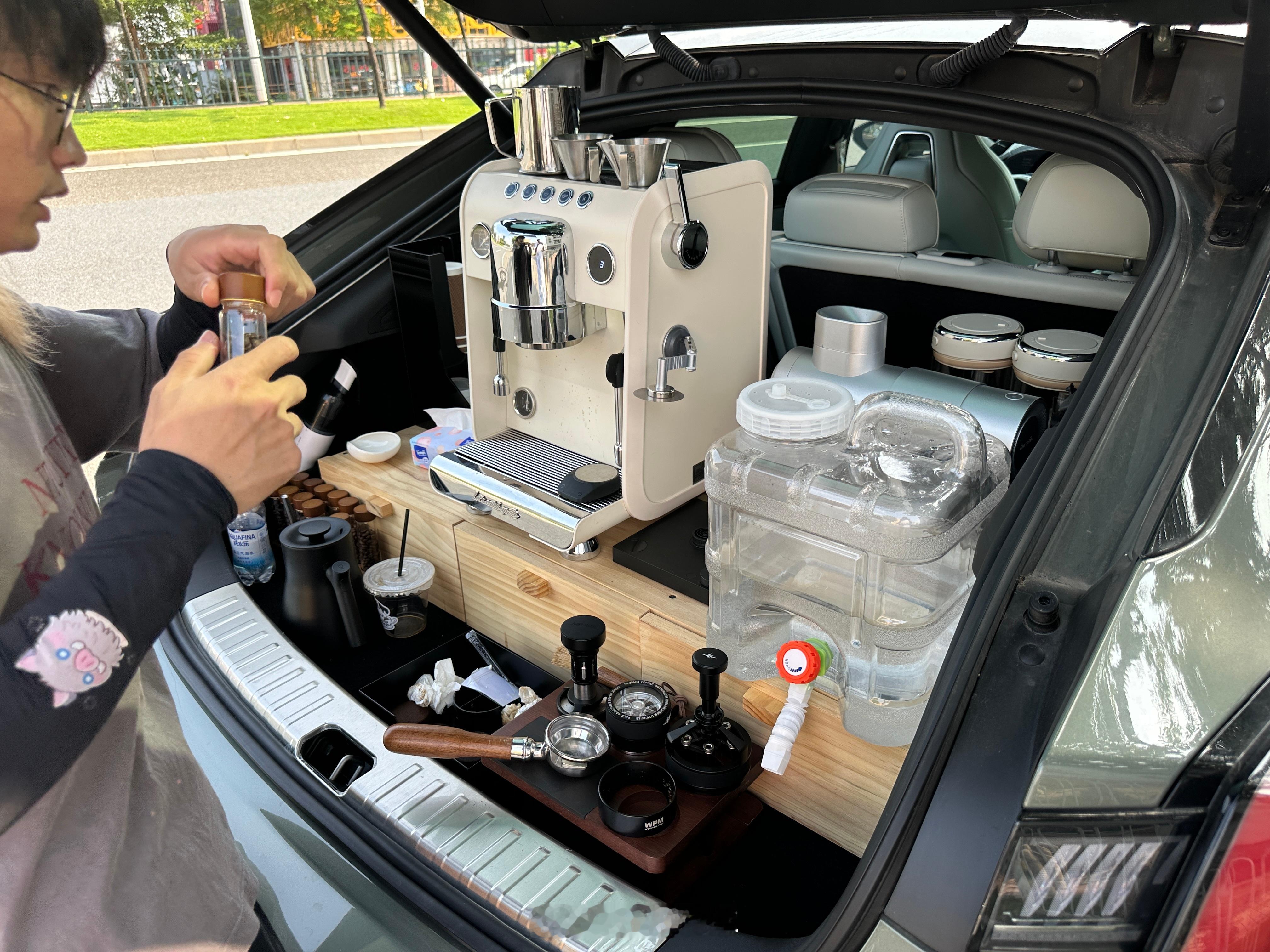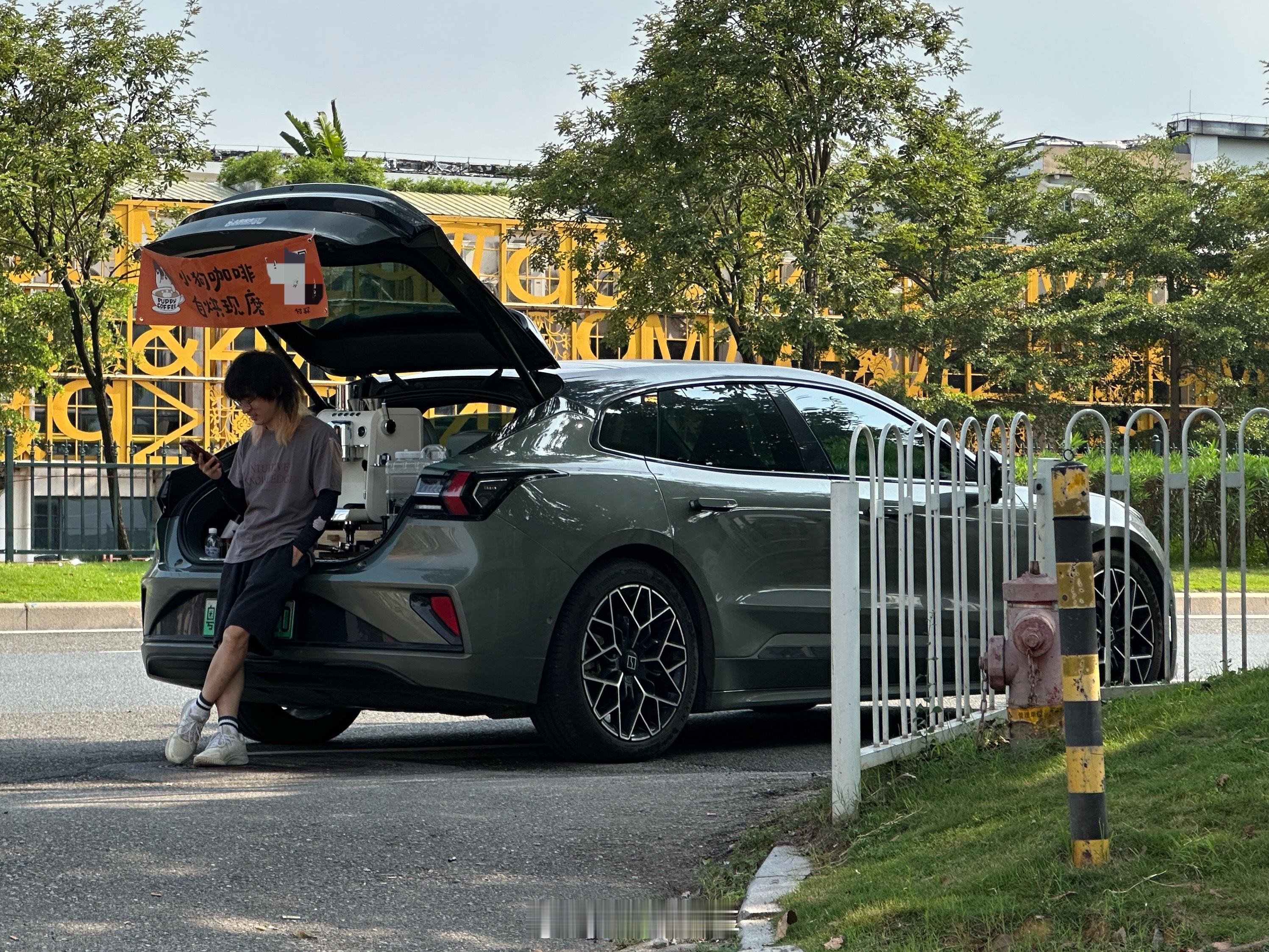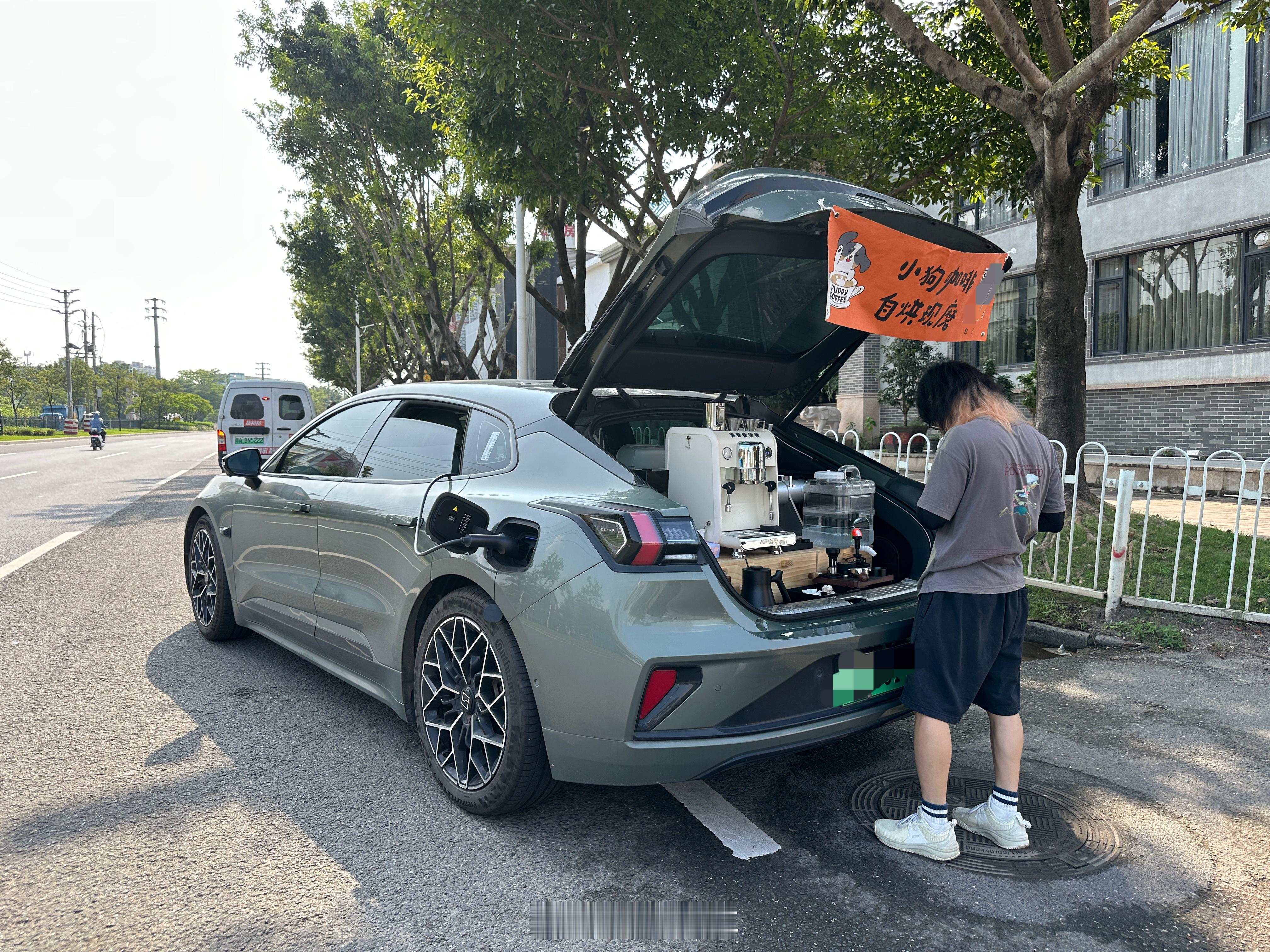 一大早公司门口遇到个大青蛙🐸在卖咖啡☕️还是第一次见到拿极氪001来卖咖啡滴~搞了一杯15块支持下,还不错。新能源车摆摊的优势就是外放电很爽,001猎装优势在后备箱放个收纳柜+咖啡机就很方便。极氪001