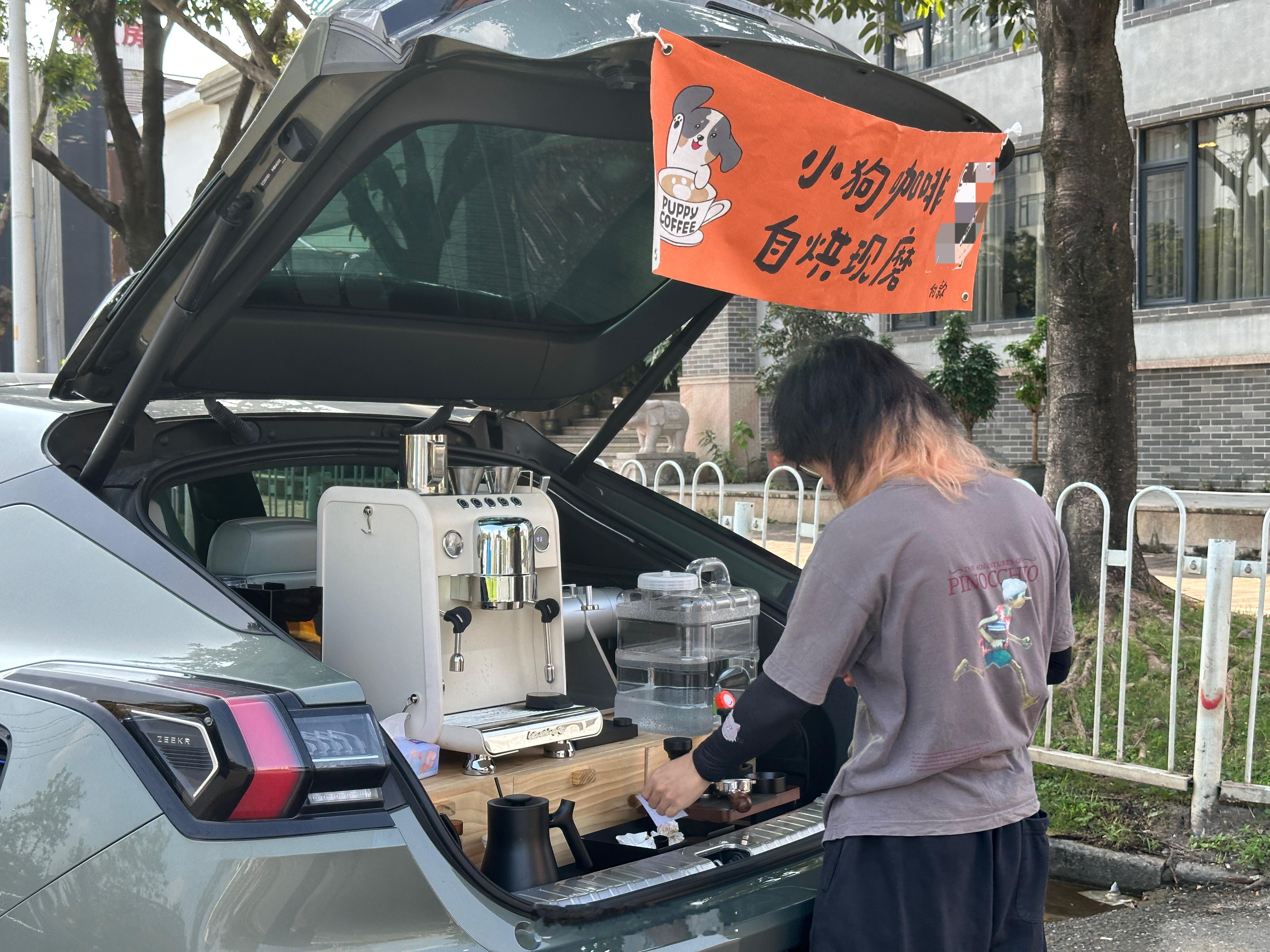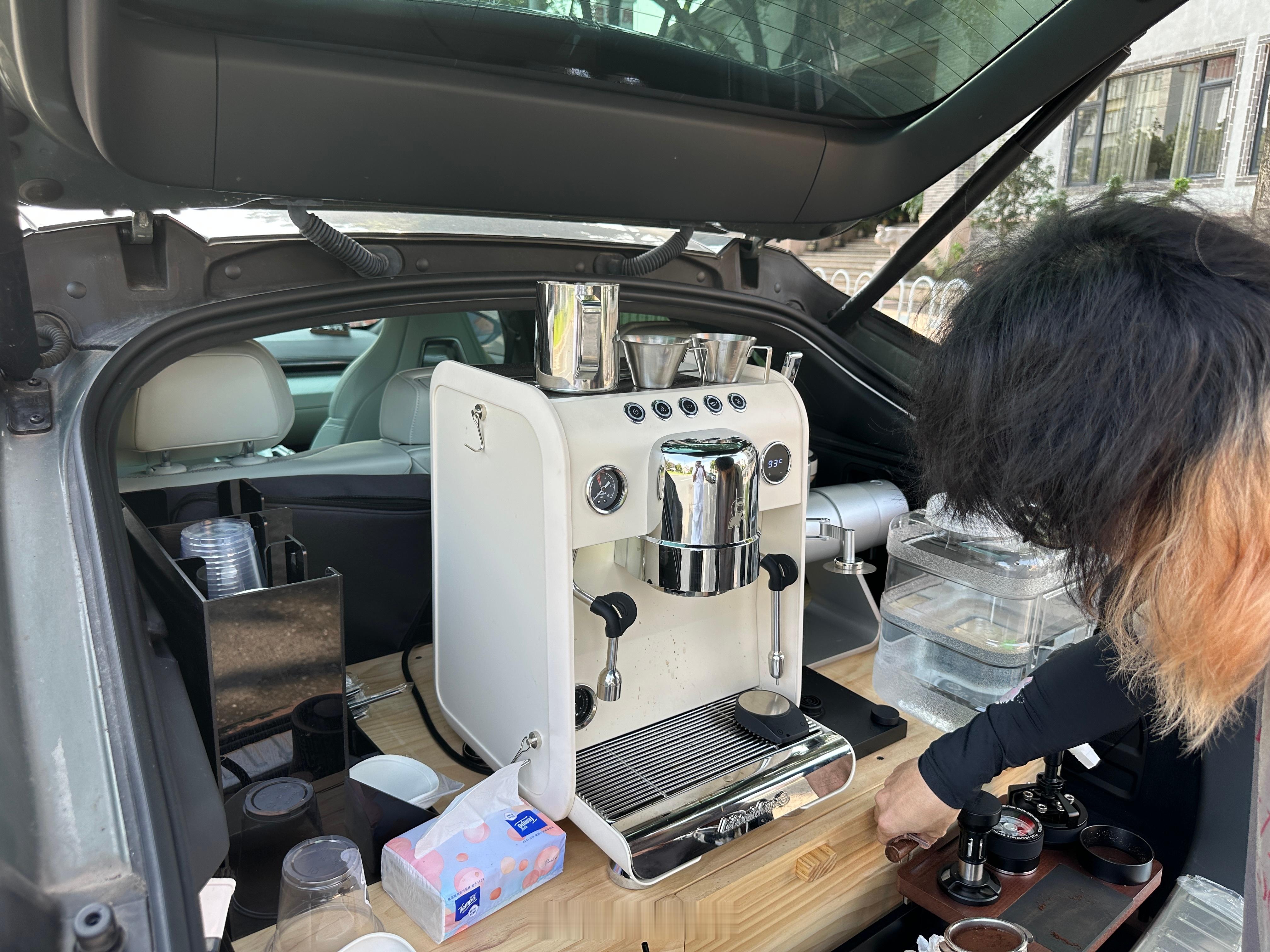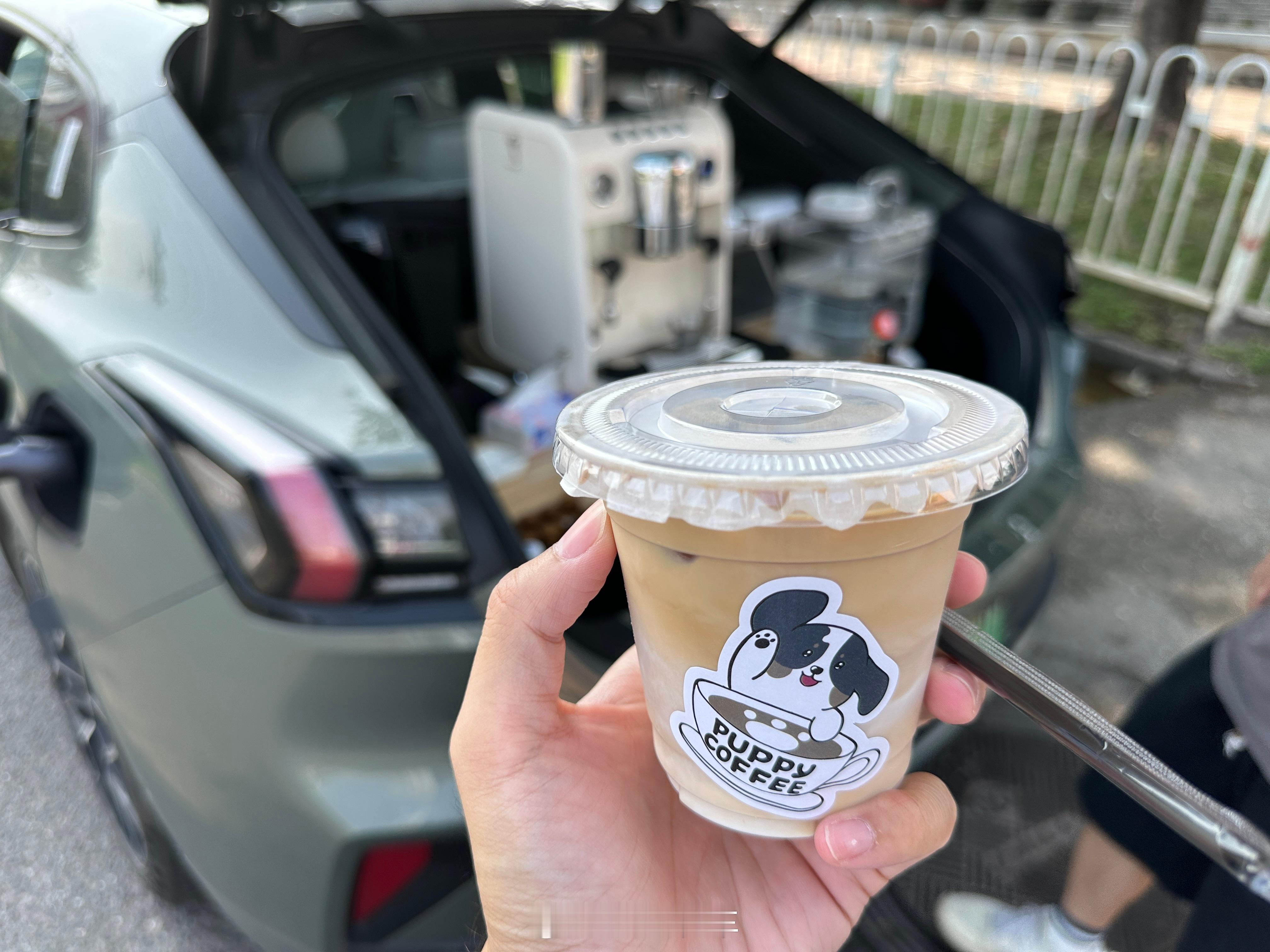 一大早公司门口遇到个大青蛙🐸在卖咖啡☕️还是第一次见到拿极氪001来卖咖啡滴~搞了一杯15块支持下,还不错。新能源车摆摊的优势就是外放电很爽,001猎装优势在后备箱放个收纳柜+咖啡机就很方便。极氪001