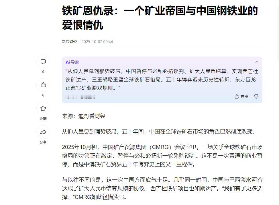中国拿到铁矿石定价权!中方“卡脖子”一周后,澳铁矿巨头同意人民币结算。 据多家外媒10月9日报道,日前,澳大利亚铁矿巨头“必和必拓”公司,已经与中国矿产资源集团签署协议,同意自2025年第4季度起,以人民币进行铁矿石贸易结算。不得不说,中国这次算是把铁矿石定价权的“命门”,彻底攥手里了!而这也是咱们头一回,在铁矿石这事上拿到定价主动权,以前被卡脖子的日子总算要翻篇了。 这事说起来也挺解气,月初的时候中国矿产资源集团,直接放了个“狠招”:通知国内所有钢厂和贸易商,暂停采购必和必拓用美元计价的海运铁矿石,不管是刚签的合同还是已经飘在海上的货,只要不换人民币结算,到港了也别想卸货。必和必拓一开始还嘴硬,说“影响不大”,结果撑了还不到一周就扛不住了,麻溜地签了协议。为啥这么快服软?还不是咱们早把后路给铺好了,他们根本耗不起。 要知道过去十年,咱们买铁矿石那真是“花钱还受气”。中国每年要进口全球75%的铁矿石,澳大利亚82%的铁矿都靠卖给咱们赚钱,可定价权却攥在人家手里。就说2025财年吧,必和必拓每吨铁矿石成本才19美元,卖给咱们的时候却能飙到109.5美元,而且只认美元。 更气人的是他们还玩“长协价+现货溢价”的套路,每年谈判跟菜市场砍价似的,咱们这边急得跳脚想压价,人家却稳坐钓鱼台,反正知道咱们钢厂离不开。2009年那起力拓间谍案还记得不?他们偷偷收买中国钢企高管,把咱们的谈判底线全摸走了,最后害得咱们多花了700亿美元,那会儿真是哑巴吃黄连,有苦说不出。 这背后其实是西方矿业巨头的“三重垄断”:资源上,四大矿山控制着全球70%的海运铁矿石;金融上,普氏指数被华尔街资本操控,想涨想跌全看他们脸色;规则上,多少年了都只能用美元结算,咱们每年花1000多亿美元买矿,相当于变相给美元霸权“输血”。 以前咱们钢厂多,各自为战,谈判的时候没个统一口径,人家一分化就把咱们拿捏了,现在不一样了,中国矿产资源集团把国内四大钢企整合到一起,对外就一个声音,腰杆自然硬了。 而且咱们早就开始布局“资源替代”了。在几内亚搞的西芒杜铁矿,明年产能就能到1.2亿吨,刚好能补上澳大利亚少供的量;俄罗斯也通过跨境铁路给咱们运矿,现在快一半都用人民币结算了。这招“东方不亮西方亮”一出来,必和必拓立马慌了。他们对华的市场份额眼看着要从20%跌到10%以下,再丢下去,饭碗都要保不住了。 金融战场上咱们也没闲着。以前铁矿石定价全看普氏指数,人家说多少就是多少,现在咱们自己搞了个北铁指数,直接挂钩青岛、曹妃甸这些港口的现货成交价,还跟大连商品交易所的期货联动。现在大连期货的交易量都成了新加坡市场的23倍,价格跟现货的相关性超过0.9,这意味着以后铁矿石定价,再也不是西方说了算,咱们的中国指数也能占一半话语权,必和必拓再想靠操纵指数抬价,门都没有。 这次人民币结算的突破,比定价权本身更有分量。以前全球90%的铁矿石贸易用美元,2023年咱们人民币结算占比才5%,今年已经涨到25%了,必和必拓这一妥协,估计到2026年底能超40%。巴西淡水河谷更干脆,现在对华贸易里28%都用人民币。 这可不是简单换个货币,而是搭起了“资源-产业-金融”的闭环——必和必拓拿到人民币,既能买咱们的电动车、5G设备,也能通过香港市场投人民币资产,钱能在国际上转起来。以前美元靠石油结算坐稳霸权,现在咱们用铁矿石给人民币铺了条“高速路”,等以后铜、铝这些金属也用人民币结算,美元的日子就更不好过了。 有人可能会问,澳大利亚为啥这么快低头?答案其实很简单:他们输不起。铁矿石占澳大利亚对华出口的38.2%,每年能赚1300亿澳元,相当于他们GDP的5%。咱们一停美元采购,他们就想找印度、东南亚当替代市场,可那些地方需求小不说,光建运输通道就得砸几百亿美元,短期根本补不上缺口。澳大利亚国库部都预测了,2025财年铁矿石出口收益要少100亿澳元,再硬扛下去,国内经济都得受影响。 其实这次铁矿石能突破,也不是突然的,是咱们从大豆、稀土上摸出来的经验。以前大豆定价被ABCD四大粮商垄断,咱们只能被动挨宰,后来扩大国内种植、开拓南美市场,慢慢才把主动权拿回来;稀土更不用说,从以前“白菜价”出口,到现在握有全球90%的加工产能,靠的就是技术积累和战略布局。 铁矿石这事,本质上是咱们从“世界工厂”往“规则制定者”转型的缩影——当最大的买家开始用人民币投票,当多元供应打破垄断,全球资源贸易的游戏规则,自然就得跟着变。 说真的,必和必拓这步妥协,只是个开始。以后咱们在资源领域的主动权会越来越多,那些曾经靠垄断欺负咱们的,早晚会明白:时代变了,想再用老套路卡中国的脖子,根本行不通了。 参考资料:新浪财经