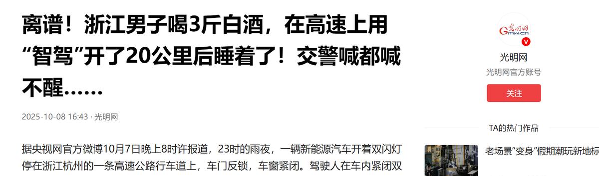 “不作就不会死!”10月7日,浙江杭州,一男子喝了3斤白酒后使用智驾开车上高速,被发现时车辆开着双闪停在高速公路上,而男子在车内呼呼大睡,民警担心他出意外赶忙破窗救援,网友:这也太大胆了,直接在高速上“露营”! 事儿发生在 10 月 7 日深夜,刚过 11 点,G4012 高速杭州段的监控里,突然拍到个特诡异的画面:一辆车没停在应急车道,就那么直挺挺地杵在行车道上,双闪灯一直闪着,跟个警示桩似的,监控拉近了看,驾驶位上坐着个男的,一动不动不知道是出了啥状况。 后来交警赶过去才发现,这哪儿是出状况啊,分明是一场被 “智能” 坑了的荒唐闹剧,驾驶位上那男的姓姜,33 岁,当时正睡得香,不管交警怎么敲车窗、喊他,都没反应。 你肯定纳闷,好端端的怎么在高速行车道上睡觉?说出来你可能都不信,这哥们儿是喝了酒,还想靠新车的 “智能驾驶” 钻空子,结果把自己坑睡着了。 原来事发前姜某刚赶完两场酒局,自己估算着喝了差不多三斤白酒,这量换作正常人,别说开车了,站都站不稳,早找代驾或者找朋友帮忙了。 可姜某不他新买了辆带智能驾驶功能的车,觉得这是个 “王炸”,心里打着小算盘,只要开了智能驾驶,就算被查,也能说 “车是自己开的,不是我开的”,既能测试下新车性能,又能躲过酒驾处罚,多 “划算”。 就抱着这种蠢到离谱的想法,他迷迷糊糊地坐进驾驶位,启动车辆开上了高速,目的地是建德的岳母家,可他忘了酒精这东西不等人,刚上高速没一会儿,酒劲就彻底上来了,眼皮越来越重,不知不觉就双手从方向盘上滑了下来,在驾驶位上睡死过去。 好在车子的安全系统还算靠谱,它监测到驾驶员没操控了,立刻启动了紧急程序,自己慢慢减速,平稳停在了行车道上,还打开了双闪,要是没这系统,后果真不敢想,深夜高速上车速都快,万一后面的车没注意,追尾了那就是大事儿。 一开始赶到的民警还以为是司机突发疾病,怕耽误救治可车门反锁着,车窗也关得严严实实,没办法,只能破窗救人,车窗一破开一股浓烈的酒精味就冲了出来,民警这才明白,哪儿是生病啊,分明是喝多了睡过去了。 这事儿传到网上网友们都看傻了,评论区里全是 “这也太大胆了,直接在高速上‘露营’啊”“这是拿自己和别人的命开玩笑” 的吐槽,还有人说 “不作就不会死,这不是自找的吗”。安全专家也出来说,不管车子多智能,方向盘始终得握在人手里,开车的时候必须保持专注,这是安全底线,任何想靠技术侥幸的想法,都是对生命不负责。 姜某还觉得自己有 “智能驾驶” 这个借口,可法律不认啊,后来司法鉴定结果出来,他血液里的酒精含量高达 205mg/100ml,远超醉驾标准(醉驾标准是 80mg/100ml),现场呼气测试也有 182mg/100ml铁证如山。 法律专家也明确说了,现在所有的 “智能驾驶” 都只是辅助功能,驾驶员才是第一责任人,只要酒后启动了车辆,不管开了多远、用没用辅助功能都算酒驾或醉驾。 最后淳安县人民法院判了,姜某犯危险驾驶罪,拘役一个月,还罚了 2000 块钱。他那套 “自动驾驶能脱罪” 的歪理,在法律面前根本站不住脚纯属自欺欺人。 是好好的找个代驾,花不了多少钱,也不会有后面这些麻烦。非要耍小聪明,觉得技术能帮自己躲规矩,结果把自己送进了看守所,还留下了案底。 (信息来源:光明网——离谱!浙江男子喝3斤白酒,在高速上用“智驾”开了20公里后睡着了!交警喊都喊不醒……)