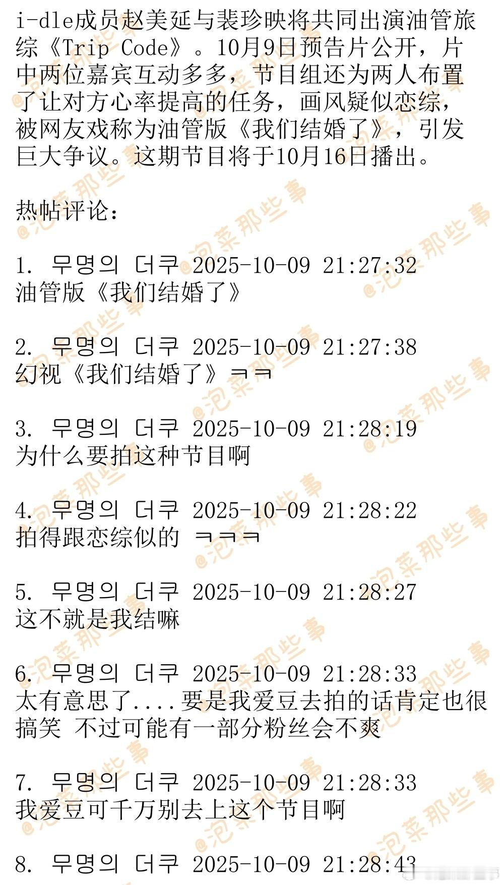 i-dle成员赵美延与裴珍映将共同出演油管旅综《Trip Code》。10月9日预告片公开,片中两位嘉宾互动多多,节目组还为两人布置了让对方心率提高的任务,画风疑似恋综,被网友戏称为油管版《我们结婚了》,引发巨大争议。这期节目将于10月16日播出。