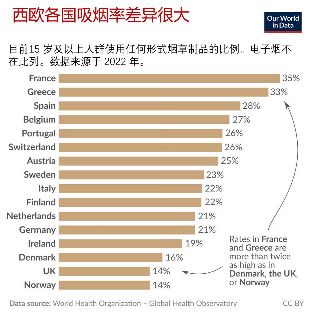 西欧各国的吸烟率差异很大,哪个国家的吸烟率高? 在下面图表中,您可以看到在西欧多个国家中,有意识使用烟草制品(主要是香烟,但咀嚼烟草也包括在内)的成年人所占的比例情况。 差异相当大。在法国和希腊,约有三分之一的成年人吸烟,这一比例是丹麦、英国和挪威等国家的两倍还多。 鉴于吸烟是导致疾病负担和过早死亡的主要风险因素之一,这些差异对公共健康而言意义重大。