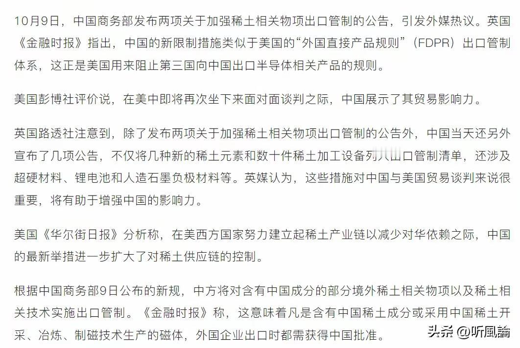 咱中国10月9号出了新规,把稀土管得更严实了。这回不光是管稀土本身,连开采、炼稀土的技术,还有用咱技术造出来的磁铁都算进去了。 外媒《金融时报》说,以后外国企业卖的东西,但凡用了中国稀土超过0.1%,或者用了咱的开采冶炼技术,都得先让中国点头批准。这不就跟美国之前卡咱半导体脖子的套路一模一样嘛! 美国从前搞了个“外国直接产品规则”,意思是别国生产的东西,只要用了他美国的技术,想卖给中国就得经过他同意。像荷兰的光刻机,明明不是美国造的,但用了美国技术,美国说不让卖咱就不能买。这是2022年10月之后美国对咱半导体限制越来越紧的招数。 这下咱也学会了,“以美之道还治其身”。新规说了,外国企业要是用了中国稀土或技术,就得老老实实打报告,特别是给美国军工企业供货,门都没有。想和中国企业合作搞稀土项目,没许可是不行的。 这么一来,中美接下来要是谈事情,稀土就成了咱手里一张硬牌。美国不在技术限制上松口,咱稀土出口就继续收紧。谁也别想再白占便宜,效果咋样,咱等着看。中国对美稀土 稀土出口限制 美国稀土战略 出口稀土 中国稀土重要性 稀土关税 稀土开发 稀土出口配额 稀土新规 稀土生产 美国稀土国产化 稀土出口新规 稀土出口许可 稀土许可 中美稀土协议