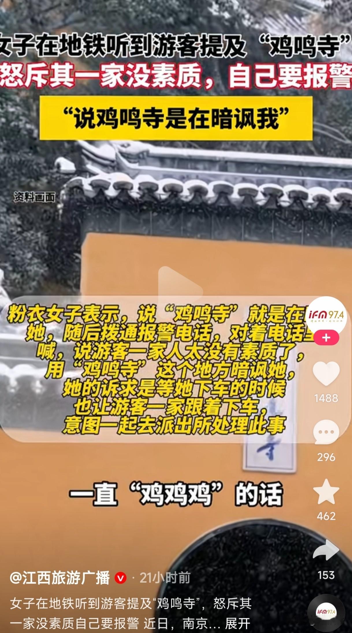 女子在地铁上听到有游客提及鸡鸣寺,怒骂游客一家没素质,女子认为游客一家在暗讽她,
