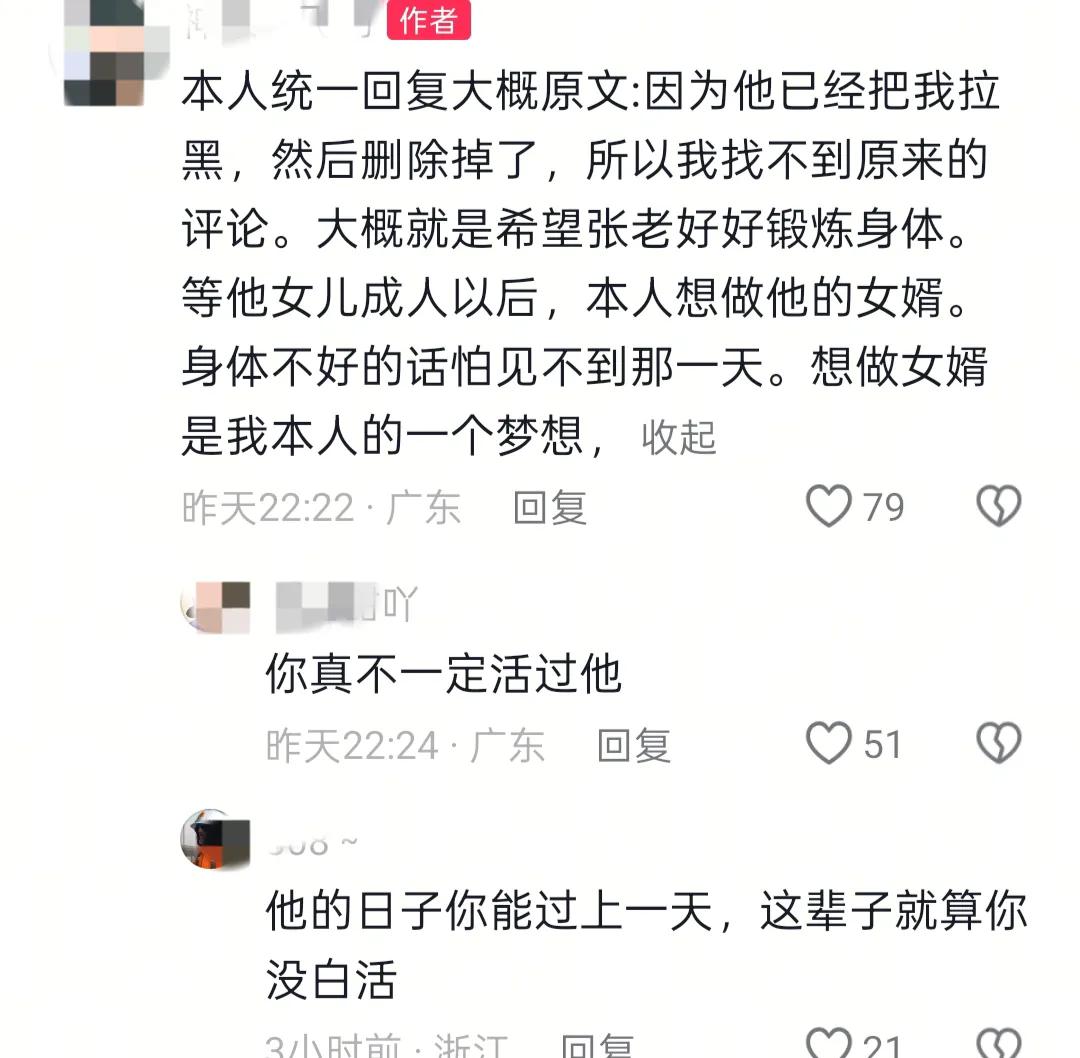 刷到个网友发帖喊冤,说被张纪中夫妇网曝了,结果扒完事情来龙去脉,我只想说:你被骂真不冤!他居然公开说,等张纪中女儿长大要当人家女婿,还让张纪中 “好好锻炼保养身体” 人家并非真心想娶他女儿,不过是拿年龄大做文章,存心恶心他罢了。毕竟他老婆一岁时,他年纪也不小了,老夫少妻虽说也正常,但传出去总归不太好听,说到底自己这也算是老牛吃嫩草。可他却只许自己这样做,不许别人说,于是网友就故意揪着这事一直说 50 岁的人想不想娶 20 岁的?肯定想啊。可真要这么做,有诸多门槛难以跨越。其中一个就是 50 岁的老丈人绝对不会同意另一个 50 岁的老男人娶自己 20 岁的女儿,这种事只能在心里想想,实在说不出口。 网友并没有实际行动,只是嘴上说说。网友期望能凭自身实力,就像张老头那样;而张老头回复说这不合伦理。谁高谁下,一目了然。 真心劝大家在网上发言别太 “放飞”,说话前先想想会不会冒犯别人。尊重是相互的,你不把别人的感受当回事,被指责了就别喊冤。毕竟嘴是用来沟通的,不是用来惹事的,守住边界感,才能少挨骂,