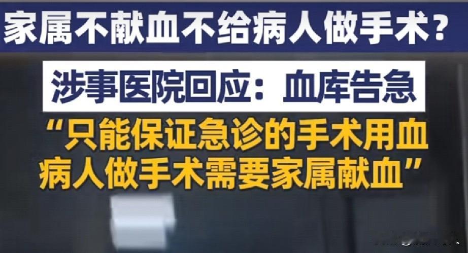 “四川某医院家属不献血不给病人做手术” 当地卫健委:家属献血费用就相对低,不献血费用就相对高 医院方面表示→ 不是不给病人手术,是血站血库也紧缺,之所以让家属献血,是考虑到用血需要先保证急诊的手术用血需求。 没有强制家属献血,只是提议,而家属方面一方面不愿意接受高价,另一方面又不接受献血。已经安排下周一给做手术了。 患者的因病而心急值得理解,医院因为工作任务繁重也值得理解,往往医患关系都是因为缺乏有效沟通产生误会而引起,医院方面需要患者的理解,患者也需要医院的关怀,双方应该多点沟通、多点包容,少点埋怨和指责,才能建立良好的医患关系! (消息来源:大象新闻)