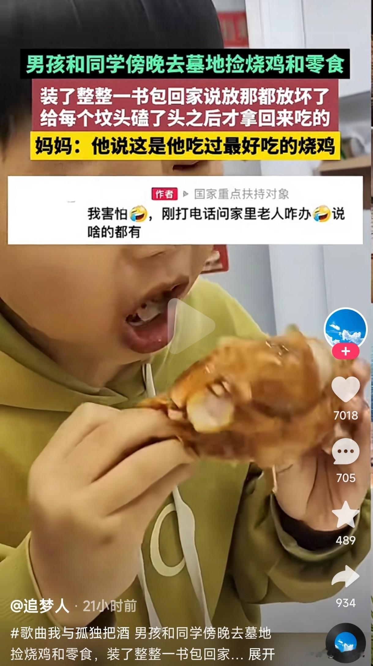 男孩和同学傍晚去人家坟头捡烧鸡和零食,装了整整一书包回家,还说放在那里也就放坏了