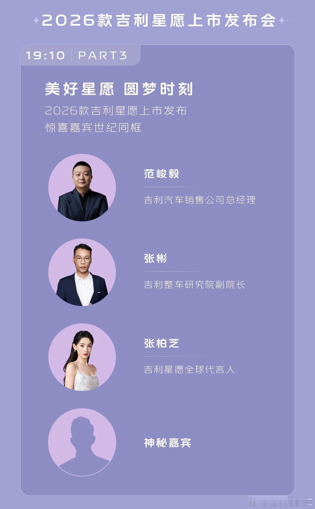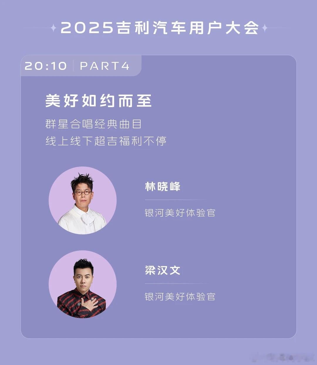 张柏芝为该车全球代言人,今晚将现身发布会。梁汉文,林晓峰将以银河美好体验官的身份参加2025吉利汽车用户大会。今晚19:10,锁定官方直播间,不见不散。
