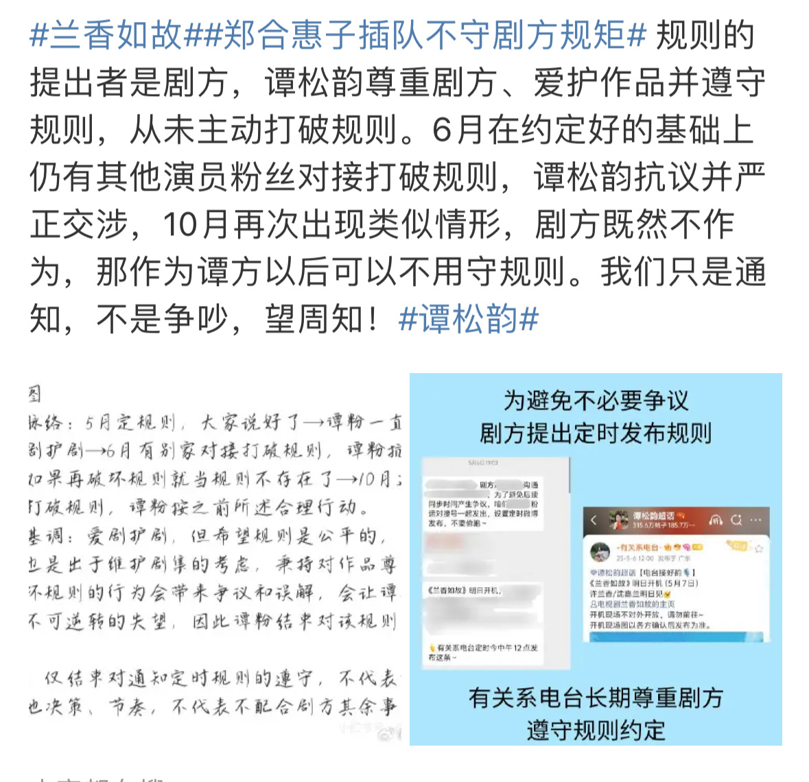 守规矩的被骂,破规矩的倒成了受害者?兰香如故剧方通知各家主创定时发布的。谭松韵家准时,其他人所以为啥非要提前啊 规矩定好了不遵守吗[疑问]