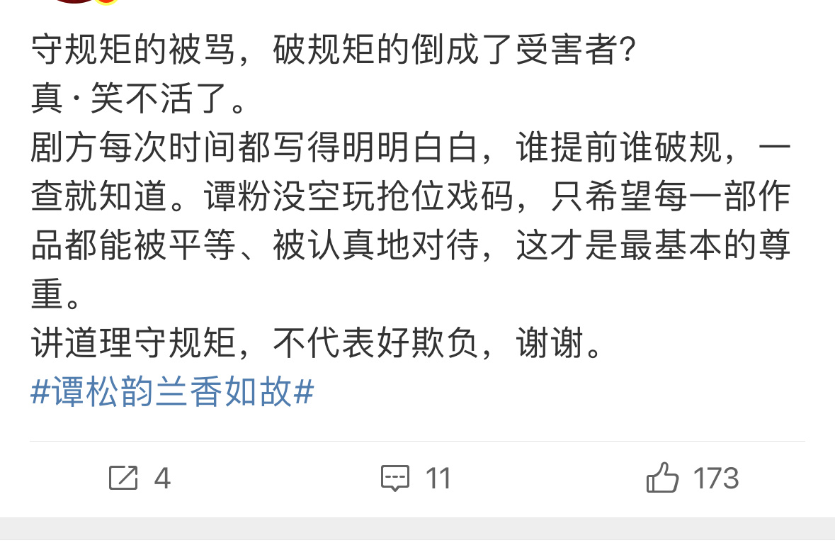守规矩的被骂,破规矩的倒成了受害者?兰香如故剧方通知各家主创定时发布的。谭松韵家