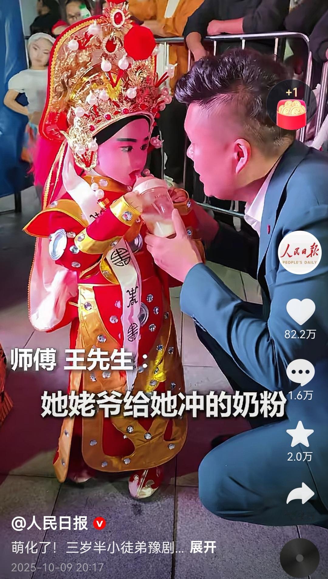 三岁半萌娃因为喝奶上了《人民日报》! 不是因为她萌,也不是因为她喝的奶粉多! 而是她能在这么小的年纪上台表演豫剧,上一秒还在姥爷怀里喝奶睡觉,下一秒音乐一起,就精神抖擞。 她师父把奶瓶从她手里拿走的时候,还担心她会哭,没想到她会毫不在乎,问她刚才是不是在姥爷怀里睡觉,连续三声“没困”来回应,在最后一声回答中,似乎让我们看到上阵杀敌的花木兰归来! 三岁半的豫剧奶娃,台上是威风花木兰,台下是奶瘾未褪小宝贝,传统戏曲的传承里,藏着这么治愈的反差萌,谁看了不喊一句豫剧萌娃yyds! 这是安徽省蒙城县的一个孩子,说起蒙城可能很多人不了解,他是庄子的故乡,当年牛群放弃演艺事业,投身治国安邦的事业的地方。他属于亳州市的下辖县,而亳州历代也是人才辈出,并紧邻河南商丘,豫剧在亳州也是相当的有地位,几乎所有的庙会都必须有台豫剧团才算完整,有时候还会有几台竞争。 到现在为止,很多家庭的红白喜事,如果请唢呐班,豫剧也是必须安排的,不然肯定是要给差评的。 可以说豫剧是上至百来岁老人下至小奶娃基本都会哼唱两句,唱的都是忠孝仁义保家卫国!拍子起来那种家国情怀止都止不住。 不过随着时代的发展,愿意下功夫学习的年轻人越来越少了,真怕哪天只能在电视里听到了。 为这些能够传承艺术献身的人点赞,为以后我们的孩子的孩子还能听到这么有意义的戏曲点赞! 你家孩子三岁半的时候都有什么趣事? 萌娃学豫剧