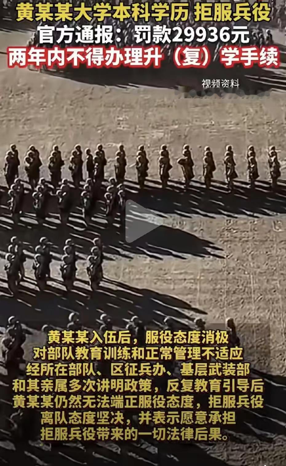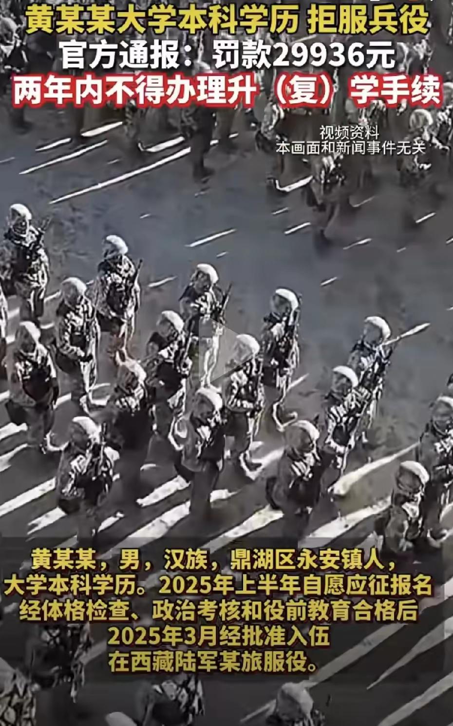 人家是“一人参军全家光荣” 你倒好了直接来一个“拒服兵役+逃兵”的称号!这会儿不止全家,乃至全鼎湖甚至肇庆市人名都谢谢你了,大哥!! 你以为户口本上“兵役状况”栏只是随便填填? 那六个字——“拒服兵役 永久”,能把一个人的人生选项划掉大半! 广东肇庆的黄同学当初自愿签了字去当兵,可三个月就扛不住了,说部队是“泥潭”,非要走,谁劝都不听,最后落了个除名处分。 这下好了,两万九罚款得交,公务员国企的门直接焊死,征信上还多了“严重失信”的黑记录,连出国都要等两年,以后找工作、相亲,人家一查名字全知道这事儿。 其实真没必要把路走死!部队的苦是真的,但想退出也有缓征、改训的正规路子,别非得选“拒服兵役”这条绝路。要我说,年轻人别怕吃苦,部队的历练说不定能把你磨得更结实,总比让六个字钉死未来强。 当初觉得自己不能吃苦就别报名呀对吧,现在你出名了,以后的路怎么办??要有后代后代怎么办?? 你身边要是有人准备当兵,你会咋劝他想清楚?拒服兵役案例