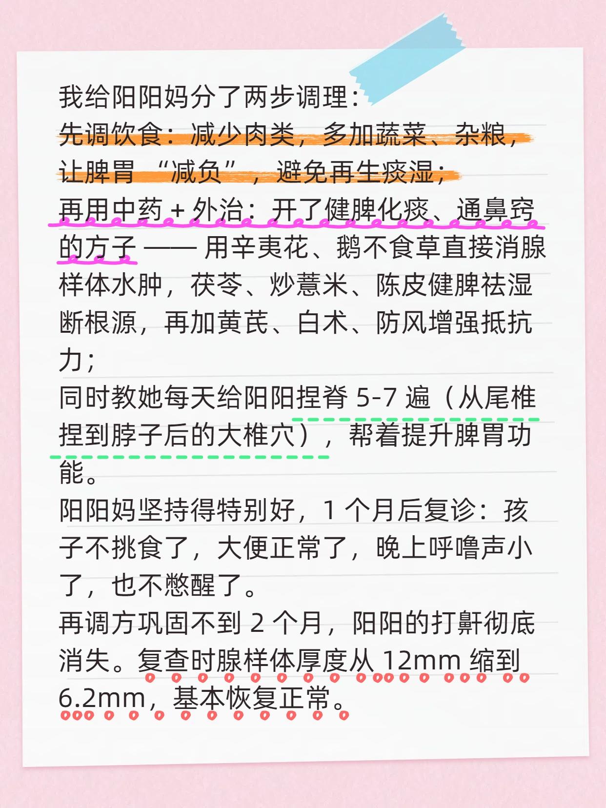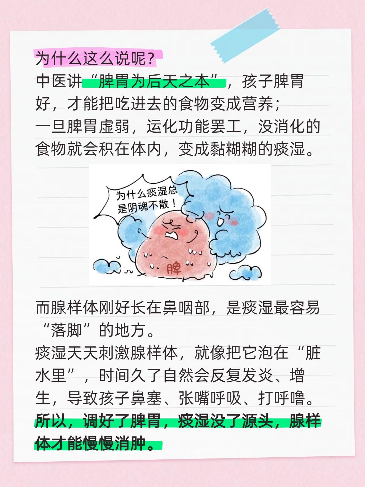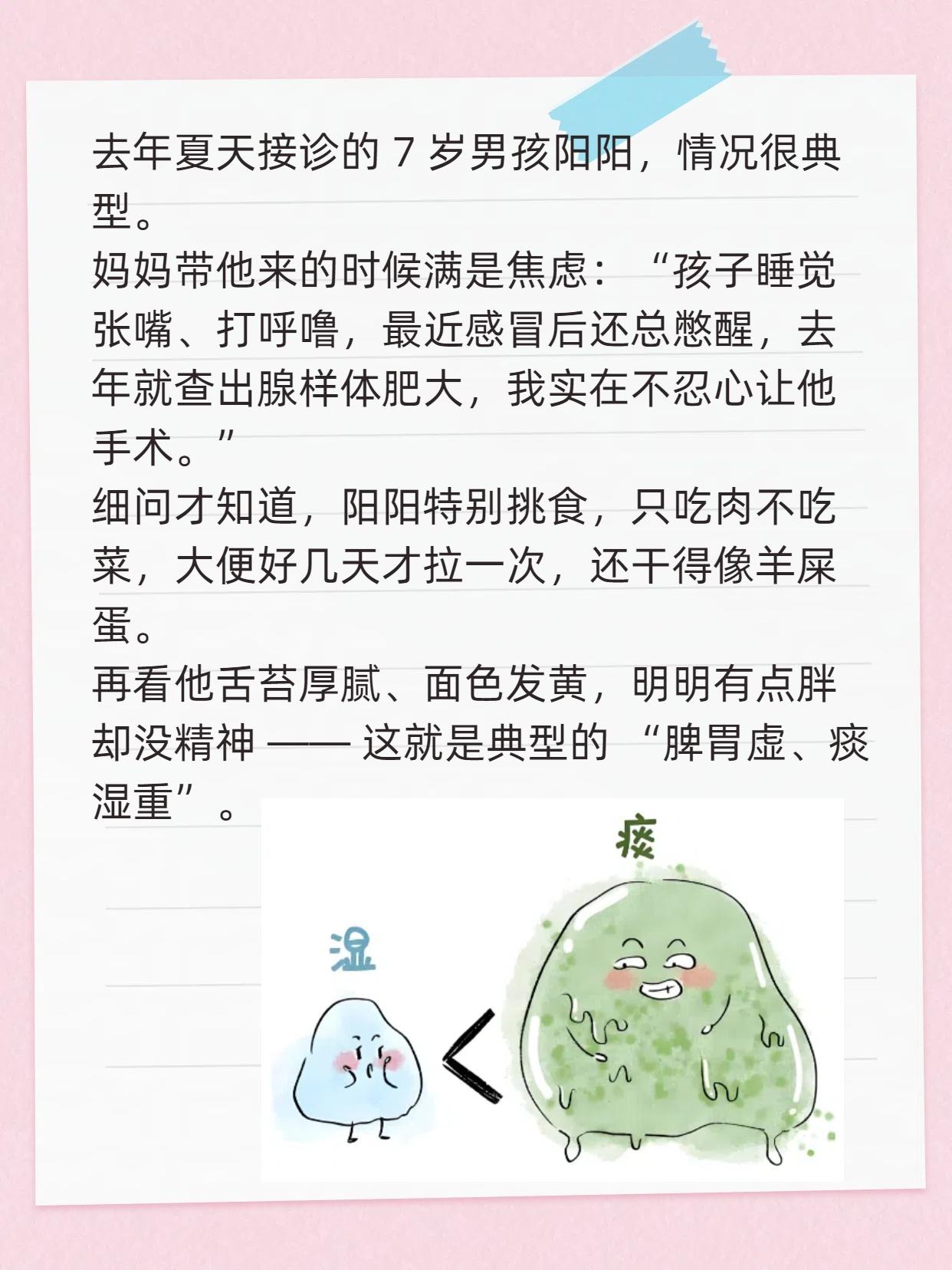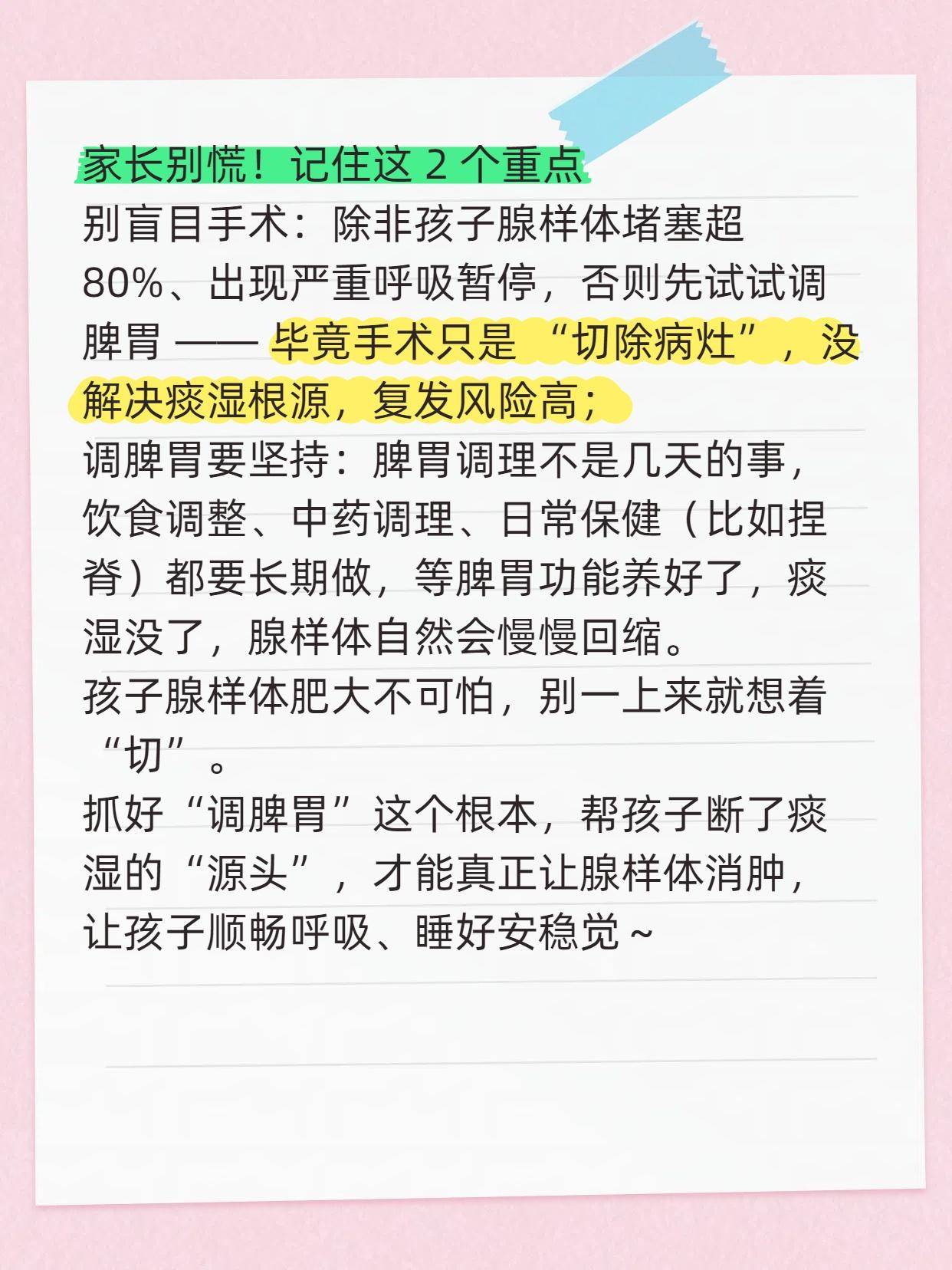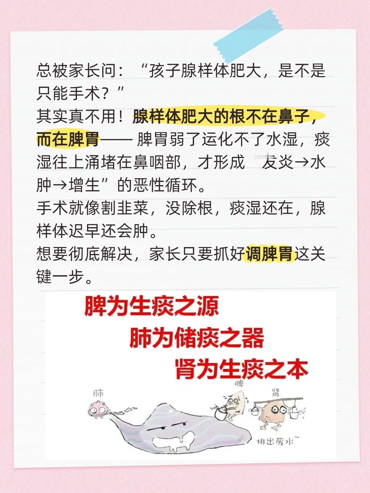 说了800遍,孩子腺样体肥大,压根儿不用动手术!家长只用做好一件事! 总被家长问:“孩子腺样体肥大,是不是只能手术?” 其实真不用! 腺样体肥大的根不在 “鼻子”,而在 “脾胃”—— 脾胃弱了运化不了水湿,痰湿往上涌堵在鼻咽部,才形成 “发炎→水肿→增生” 的恶性循环。 手术就像割韭菜,没除根,痰湿还在,腺样体迟早还会肿。 想要彻底解决,家长只要抓好 “调脾胃” 这关键一步。 为啥调脾胃能治腺样体?看中医怎么说 中医讲 “脾胃为后天之本”,孩子脾胃好,才能把吃进去的食物变成营养;一旦脾胃虚弱,运化功能 “罢工”,没消化的食物就会积在体内,变成黏糊糊的 “痰湿”。 而腺样体刚好长在鼻咽部,是痰湿最容易 “落脚” 的地方。 痰湿天天刺激腺样体,就像把它泡在 “脏水里”,时间久了自然会反复发炎、增生,导致孩子鼻塞、张嘴呼吸、打呼噜。 所以,调好了脾胃,痰湿没了 “源头”,腺样体才能慢慢消肿。