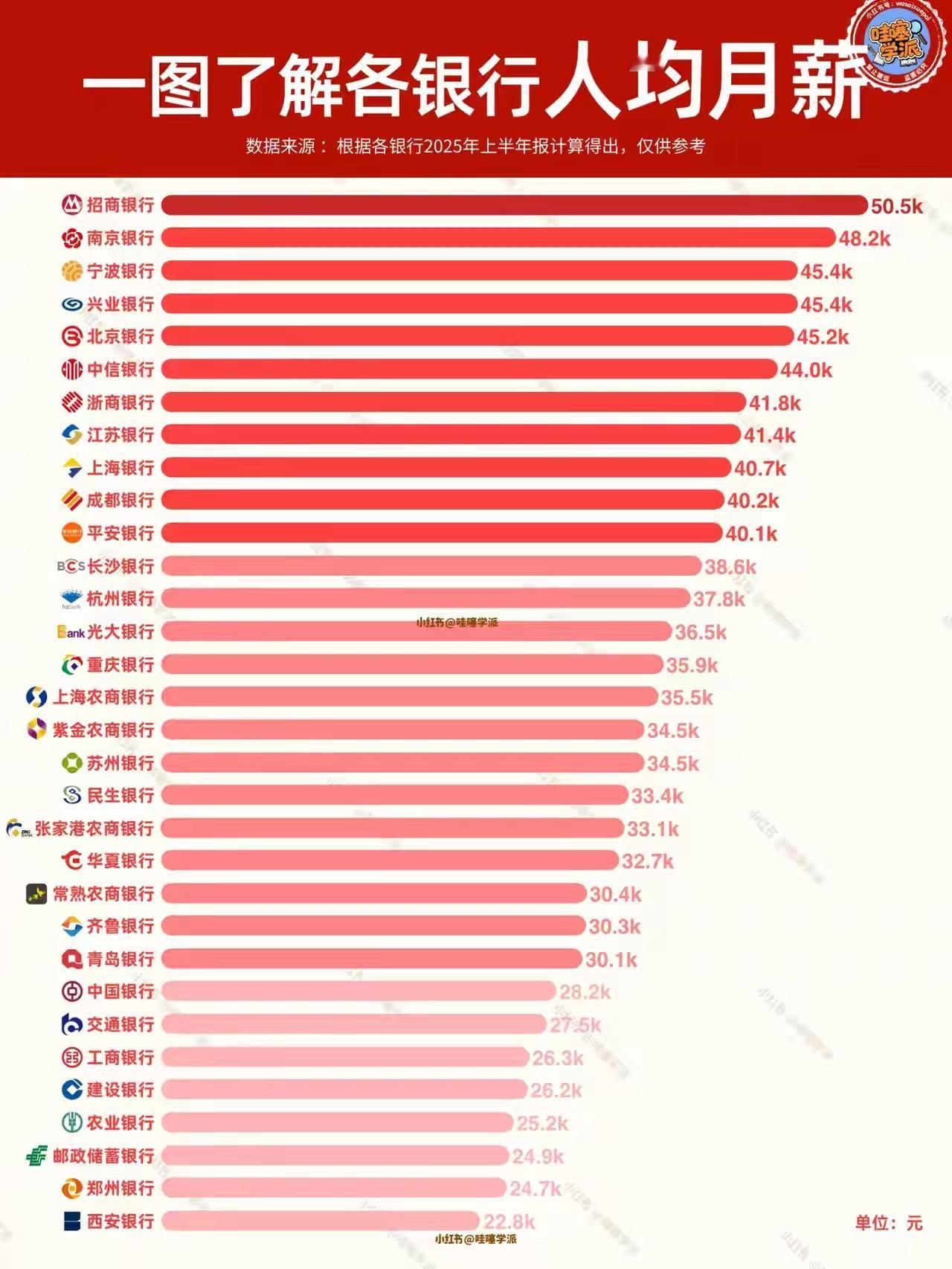 头条上很多唱衰银行的内容 但是你知道银行员工收入有多高吗 根据各上市银行半年报 有人整理出各银行人均月工资 这待遇也忒好了吧 抛开股份制银行不说 单说四大行分别是 中行2.82万,工行2.63万,建行2.62万,农行2.52万 不知道头条有没有银行的小伙伴,看看你到平均数了吗?