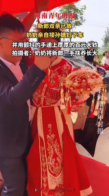 “看哭了!”10月8日报道,江苏一新郎在接亲迎娶新娘时,因为父母都已经去世,他的奶奶亲自来接孙媳妇下车,还用双手颤抖着递上了厚厚的一沓钞票,网友:这里面沉甸甸的都是奶奶的爱啊![玫瑰] 江苏一场婚礼上,当婚车停在新郎家门口时,一位80多岁的老人颤颤巍巍地走到车前,她用双手捧着一沓百元大钞,递给刚下车的新娘。 老人是新郎的奶奶也是他唯一的亲人,新郎父母双双离世,是奶奶用退休金和打零工的收入把他拉扯大,如今孙子有了工作找了女朋友。 奶奶准备这笔下车钱用了整整一年时间,她每个月退休金不多,平时省吃俭用连水果都舍不得买,去年孙子说要结婚后,她就开始从每月生活费里抠出钱来,一点一点攒够了这个数。 按照当地习俗新娘下车前男方家要给下车钱,一般在几百到几千元不等,这笔钱象征着对新娘的欢迎,也是给小两口的启动资金。 但像奶奶这样给出这么多的并不常见,尤其对于一个靠退休金生活的老人来说。 婚礼现场的宾客大多知道新郎的身世,看到这一幕都很感慨,新郎的同事说小伙子平时工作认真,为人厚道但很少提起家里的事。 大家只知道他是奶奶带大的,没想到老人为了这场婚礼准备了这么久。 这场婚礼的视频被亲戚传到网上后,引起了不少关注: “看到奶奶递钱时手都在抖,真是被打动了。” “老人为了子女婚礼也是省吃俭用准备了很久。” “看哭了,多好的奶奶呀。” “这沓钱的分量太重了,这可能是奶奶省吃俭用攒了一辈子的积蓄,里面包的哪里是钱啊,分明是奶奶毫无保留的爱。” “奶奶颤抖的手,撑起的是孙子的一片天,她今天站在这里,就是告诉所有人,这个家还有长辈在,有依靠,有底气。” “新娘愣了一下说明她是个善良的姑娘,没想到会是奶奶来,她接过钱的瞬间,就是接过了对这个家的责任和爱,以后肯定会和孙子一起好好孝顺奶奶的。” “比起那些因为改口费、下车钱闹别扭的家庭,奶奶的这份心意纯粹得让人落泪,习俗的真谛是情义,而不是讨价还价的生意。” “奶奶辛苦了半辈子,终于盼到了这一天,祝她健康长寿,等着抱重孙子!” “希望小两口往后余生,好好孝顺奶奶,让她享享清福。” “希望这个经历风雨的家庭,从此充满阳光和幸福 。” “新郎没有父母在世,缺少了一部分父爱和母爱,但是有这样一位奶奶在背后默默支持他,这恐怕才是他成功的最大动力!” 看了这个温暖的故事,不知道您有什么感触?在您看来现代婚礼中,哪些传统习俗最应该被珍视和传承?欢迎在评论区分享您的看法和经历! 信息来源:河南青年时报