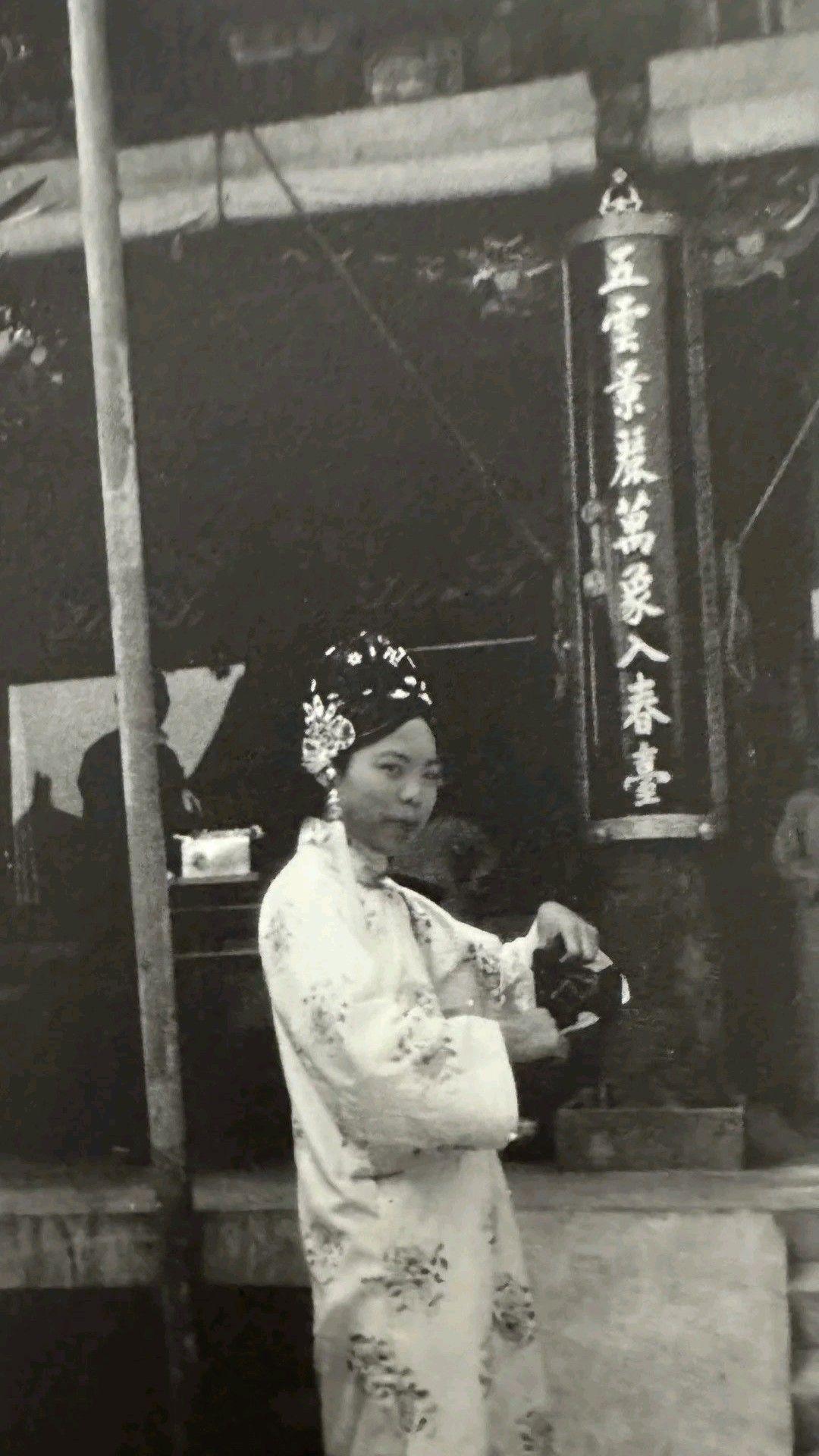 照片是末代皇妃文绣,她身着带有雅致花纹的传统旗装,衣料色泽温润,头上梳着精致的旗头,装饰有华美的头饰,于端庄之中透着温婉。古朴的建筑构件,旁侧立柱悬挂着题写“五雲景簇萬象入春臺”的楹联,笔墨苍劲,为画面增添了浓厚的古典文化氛围。