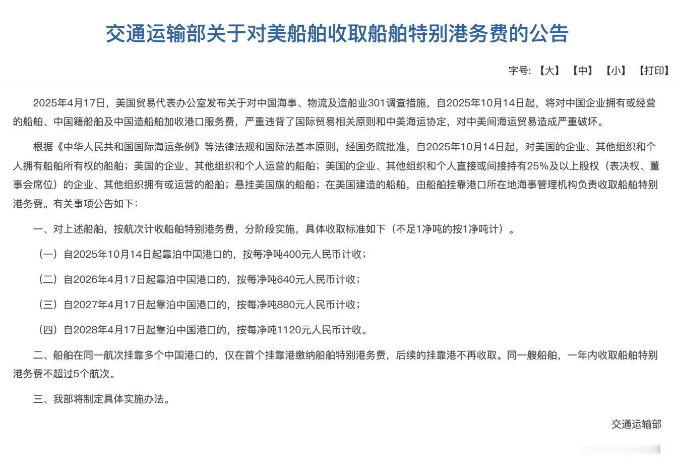 【交通运输部:对美船舶收取特别港务费】