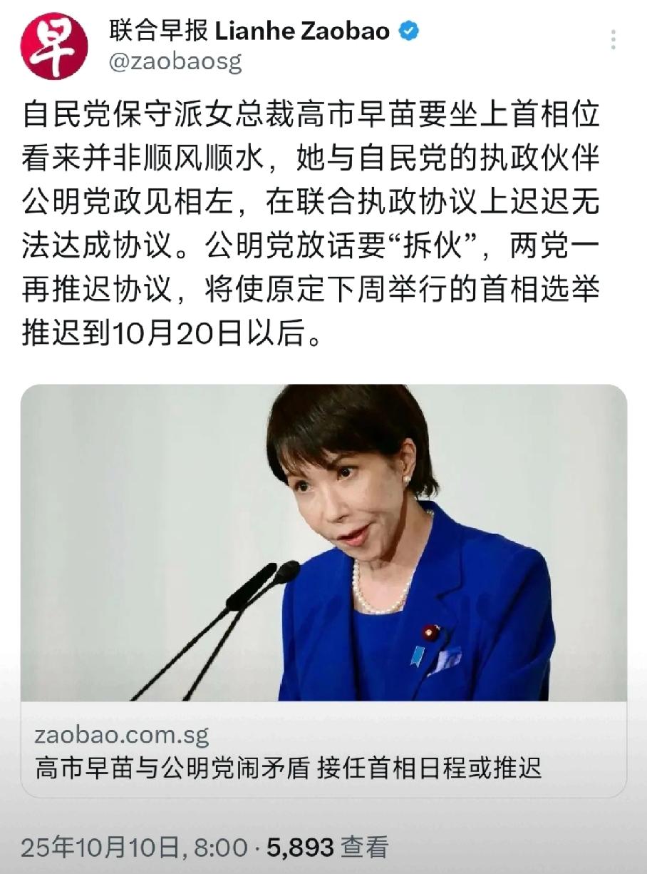 突发新闻:日本公明党“拆伙”,第一女首相或“夭折”,高市早苗高兴早了 数小时前,据来自外媒的消息显示,高市早苗与齐藤铁夫产生矛盾,双方在政见上相左,导致自民党与公明党产生隔阂,原定的首相选举被推迟到10月20日以后。 然而这一切变化来的太快,就在刚刚,央视新闻显示,日本公明党正式向高市早苗表达了退出执政联盟意向。 也就公明党“拆伙”了,在这种情况下,高市早苗是否会成为日本第一位女首相,将打上大大的问号…… 分析人士认为,执政联盟的破裂,或许导致一系列连锁反应,很有可能,自民党将再次选举,以换取伙伴的合作。 国际