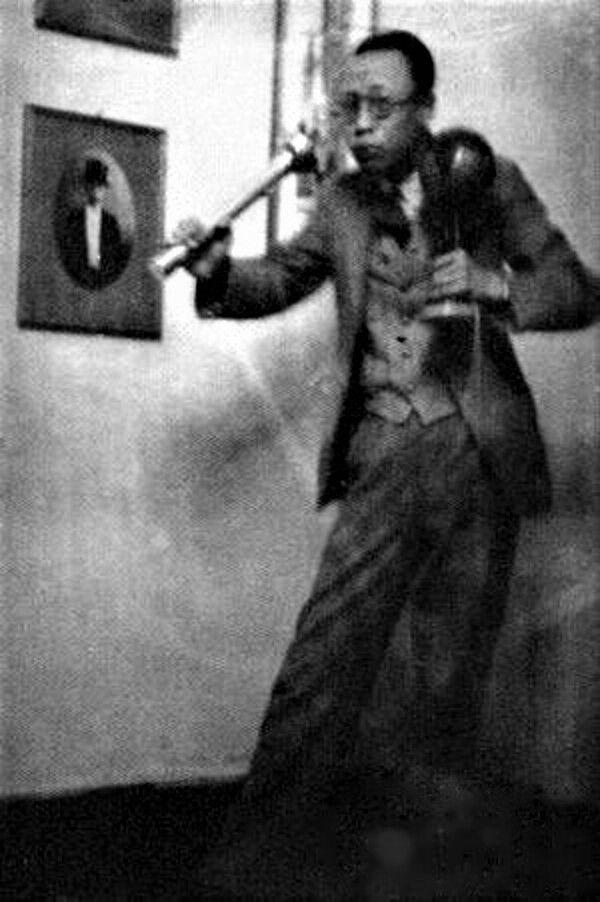 照片中的溥仪身着一套西式西装,内搭马甲与衬衫,他手持类似老式扩音或录音器具的物件,身体姿态富有动态感,不再是常见的端庄肃穆模样,仿佛正专注地进行某项操作。整体姿态在溥仪的影像记录里较为少见,传递出一种别样的鲜活感。