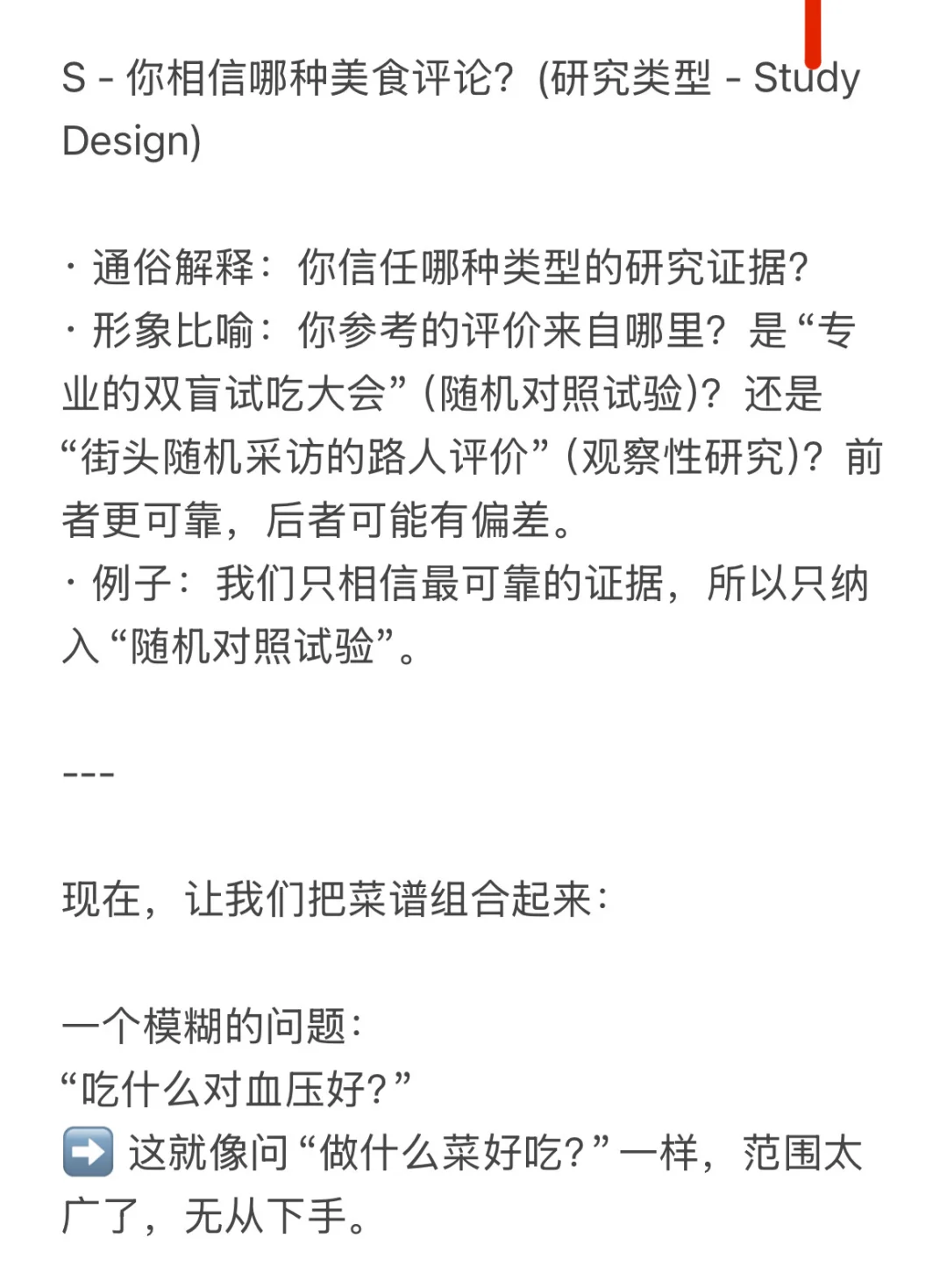 · 形象比喻:你参考的评价来自哪里?是“专业的双盲试吃大会”(随机对照试验)?还是“街头随机采访的路人评价”(观察性研究)?前者更可靠,后者可能有偏差。