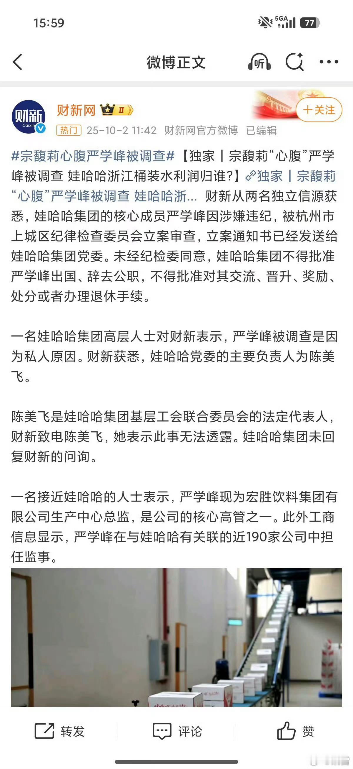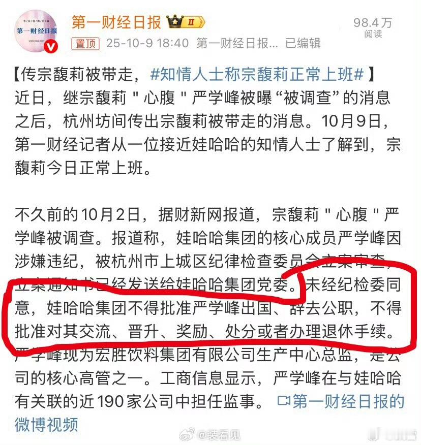 宗馥莉心腹严学峰被调查捉放曹,解除立案审查,回去上班。