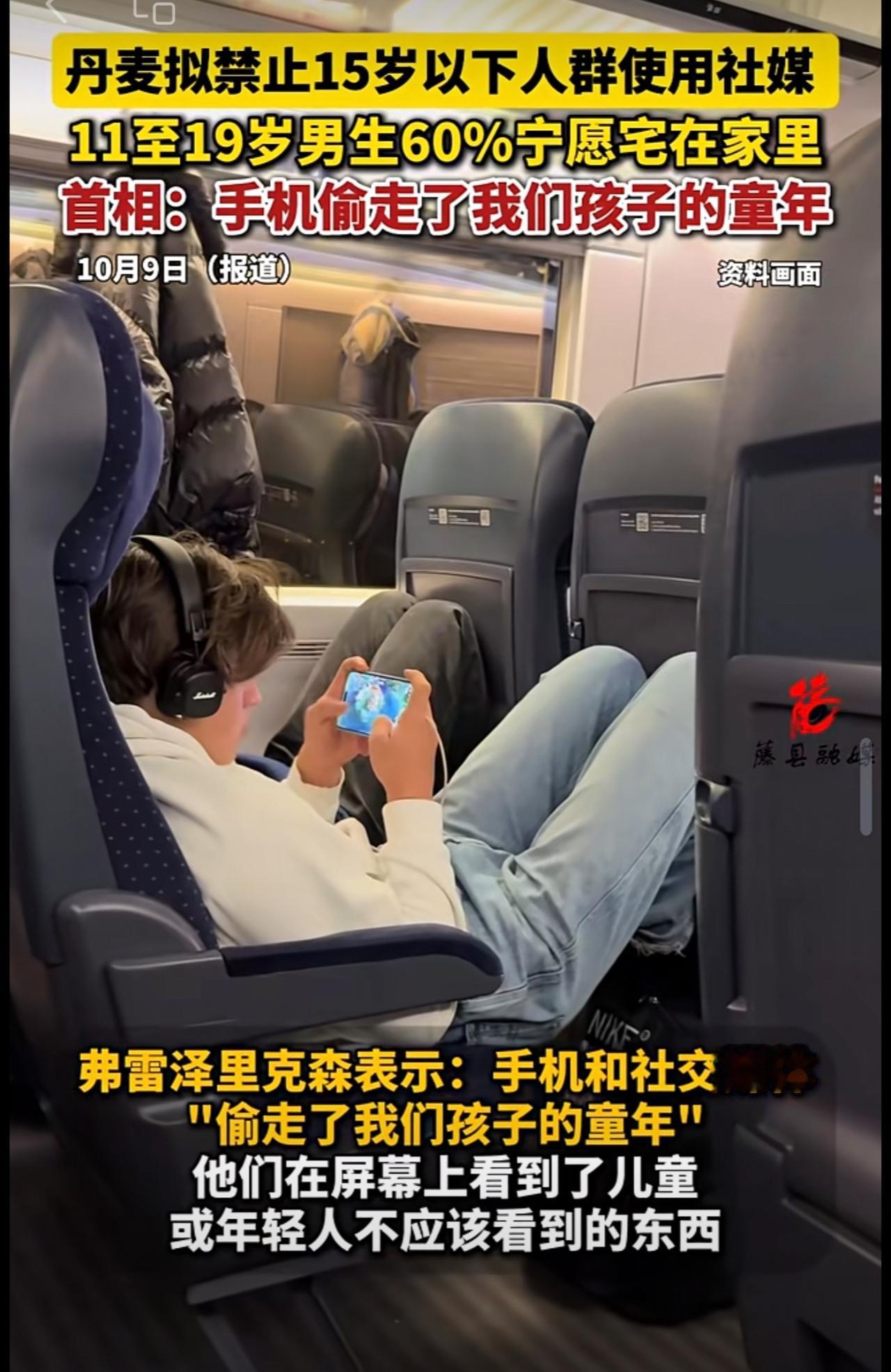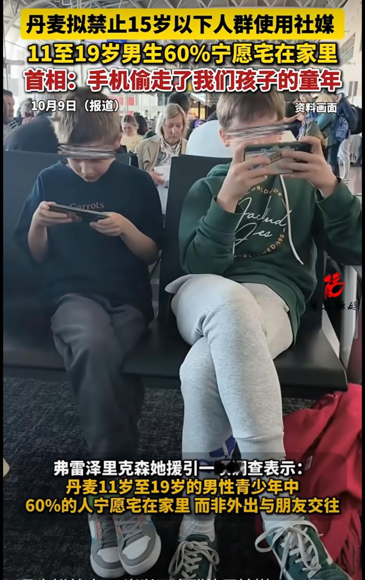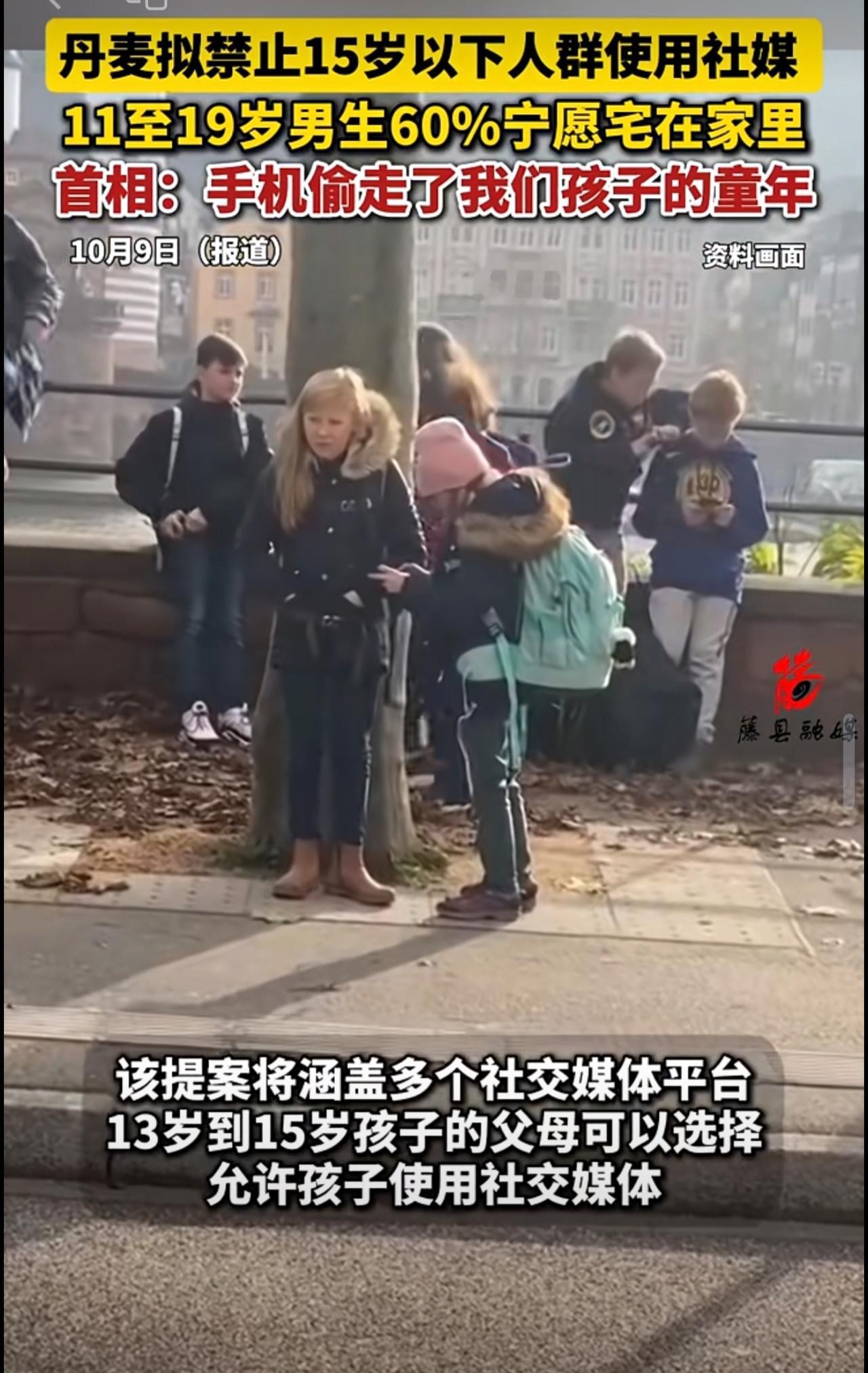 丹麦拟禁止15岁以下人群使用社媒,11至19岁男生60%宁愿宅在家里,首相:手机偷走了我们孩子的童年。