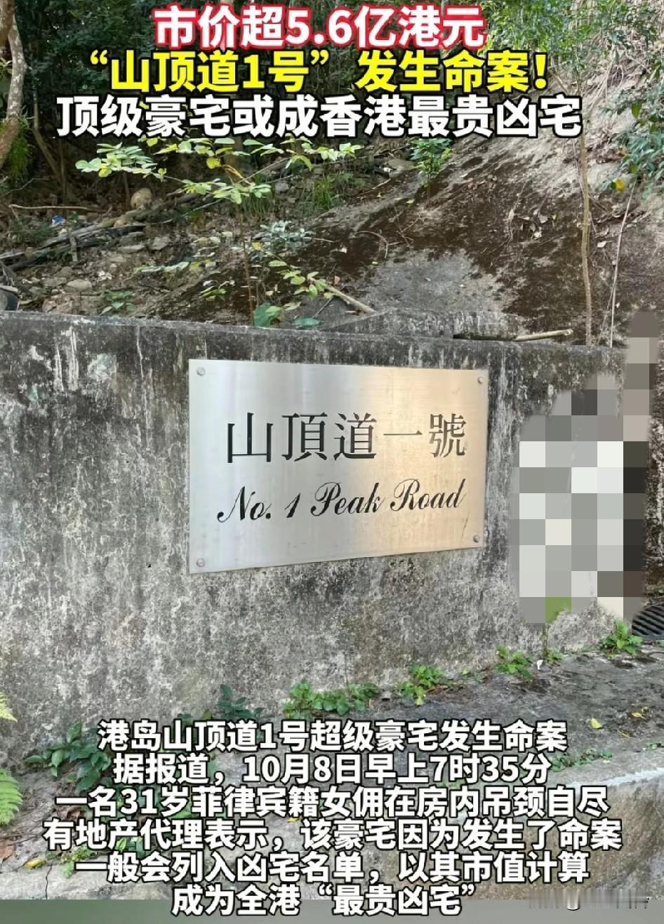 31岁女菲佣在富商张松桥豪宅内上吊自杀,豪宅或成凶宅,曾经是金庸旧居 曾志强先生曾说,所有的豪宅都守不住。香港有钱人非常迷信,更何况买得起这种房子的人屈指可数,很难出手的,金字塔塔尖就那些人而已。麻烦了,这保姆是发生什么事害这户人家 香港蔡天凤碎尸案那栋房子更惨,房东都倒霉死了,一辈子都不可能再住人了。上海那个杀妻的那栋楼都没有人敢住,邻居能搬都搬了,也没有人敢买,这种房子没有人敢住。