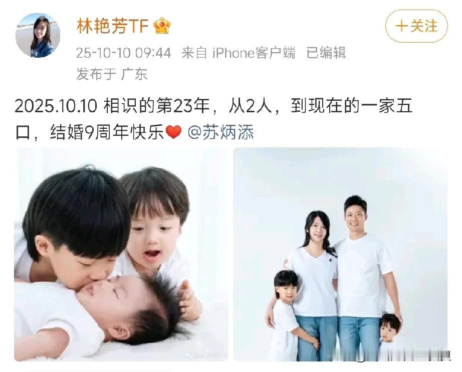 苏炳添老婆发文,『相识的23年,从2人,到一家五口,结婚9周年快乐』 这条文案内容不多,却有很多看点。 •他俩36岁,相识已经23年,13岁居然就认识了。感觉运动员好多都是养成系婚姻啊! •结婚9年,竟然生了3个娃,看得出来感情很好。对此林丹谢杏芳,结婚15年就一个娃。[呲牙] •虽然苏炳添是小米手机代言人,雷军还赠送了他一台小米汽车。但人家两口子就是喜欢🍎手机。 苏炳添当时代言一到期,就换回了🍎,老婆这么多年也一直是🍎忠实用户。[笑哭] 看来,雷总要想得到苏神的认可,还得继续努力啊![呲牙]
