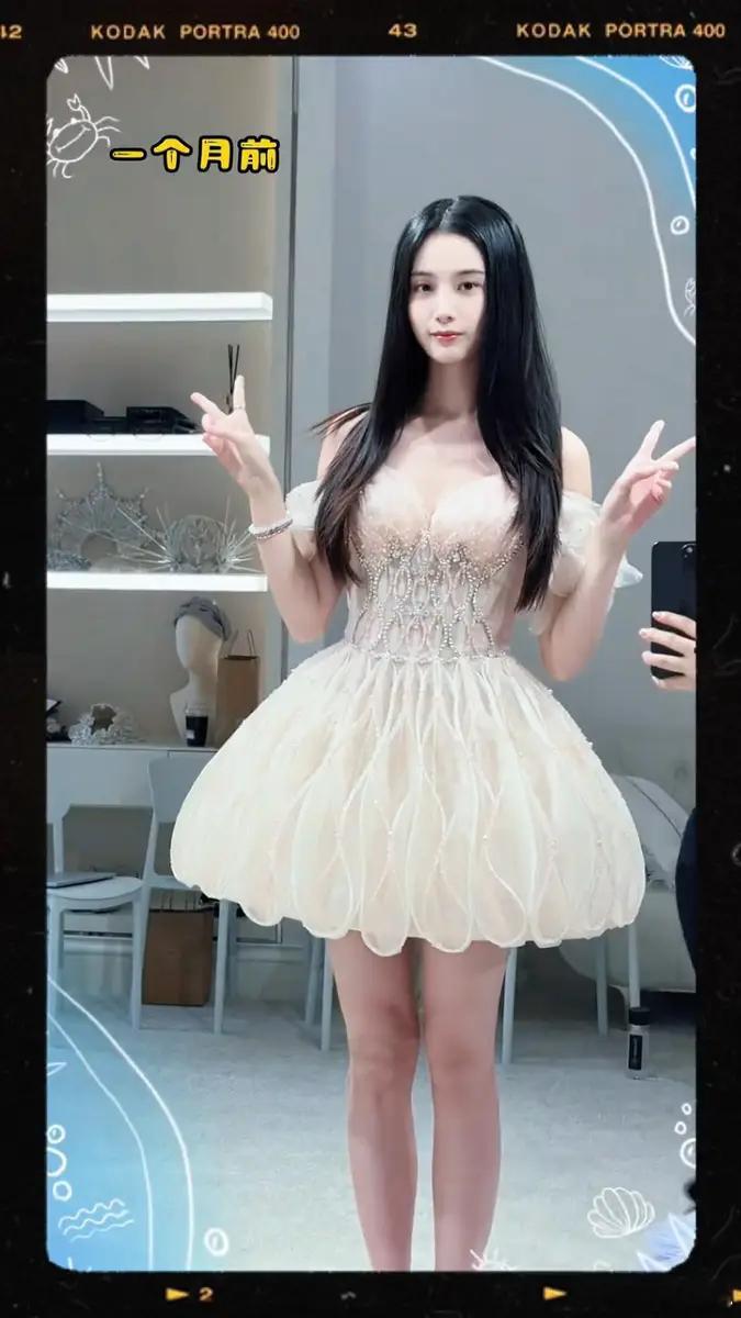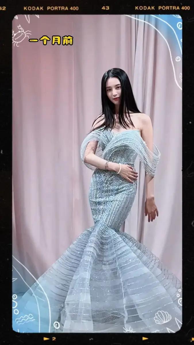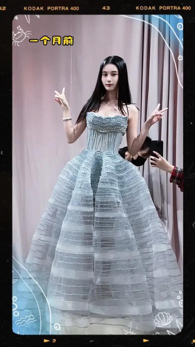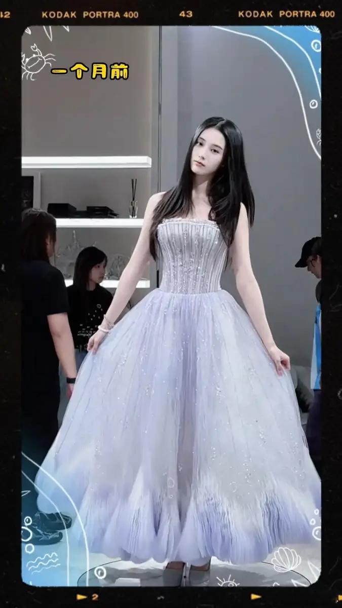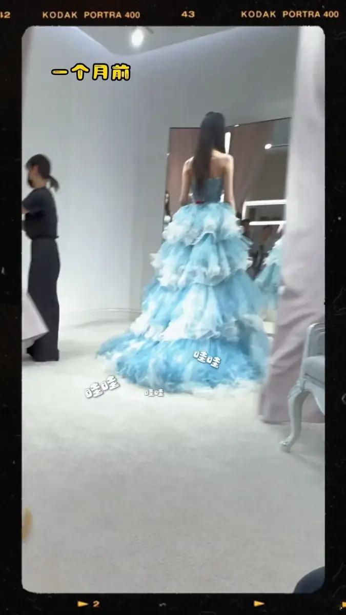 近日,徐艺洋试婚纱的花絮视频流出。图中,她穿着浅蓝色层叠抹胸婚纱,比耶摆拍,尽显梦幻甜美气质。