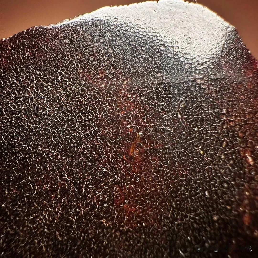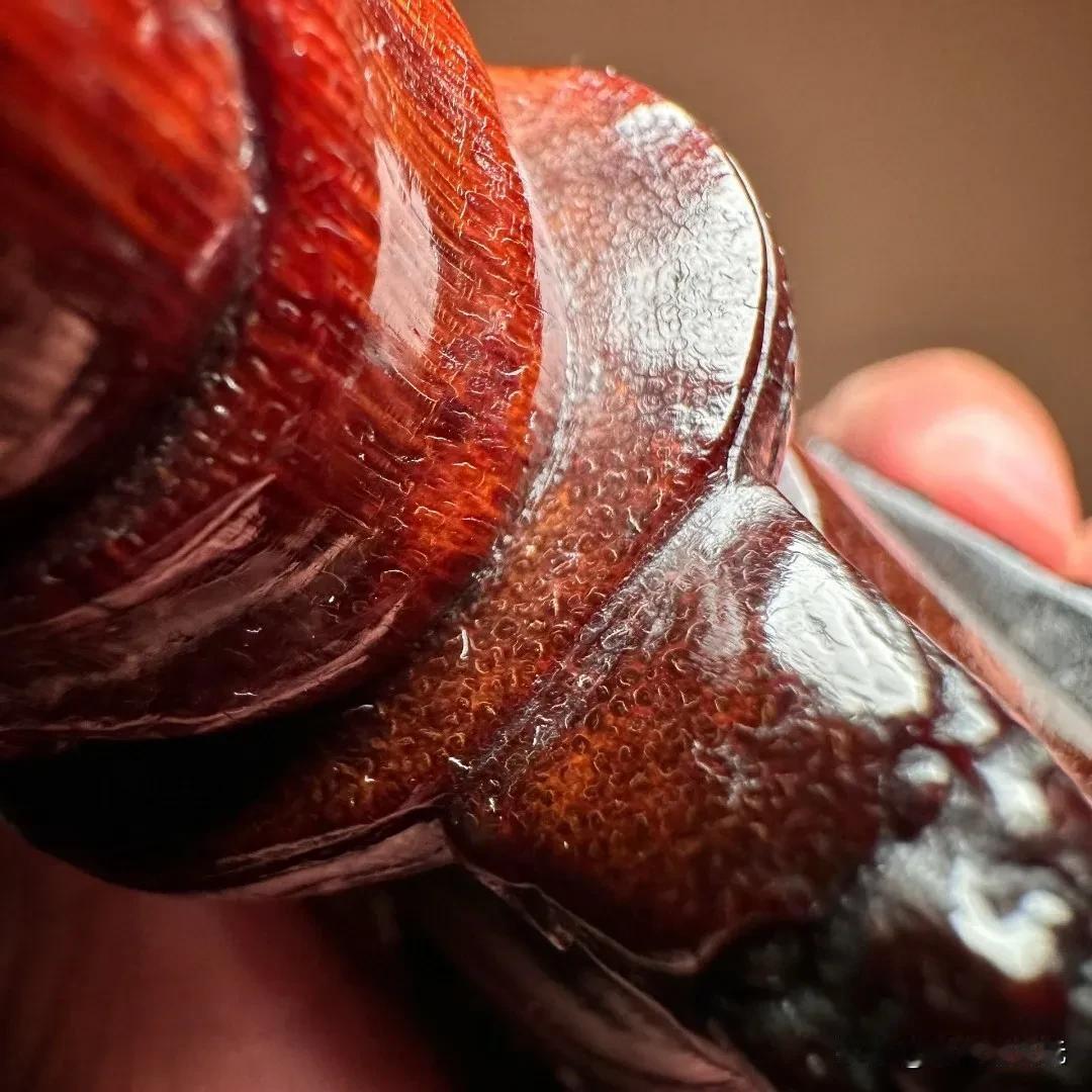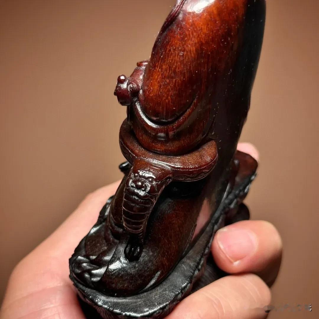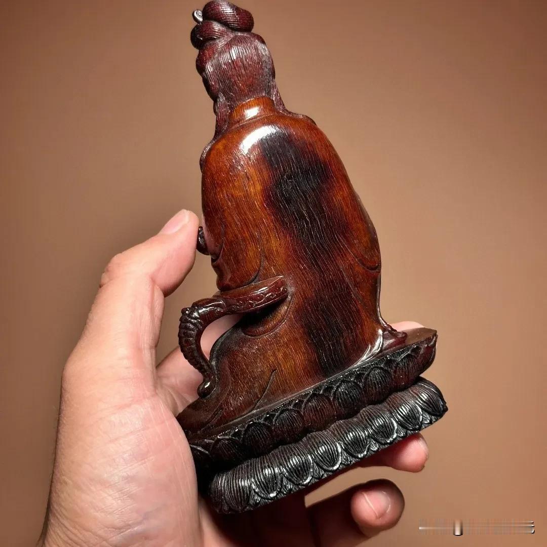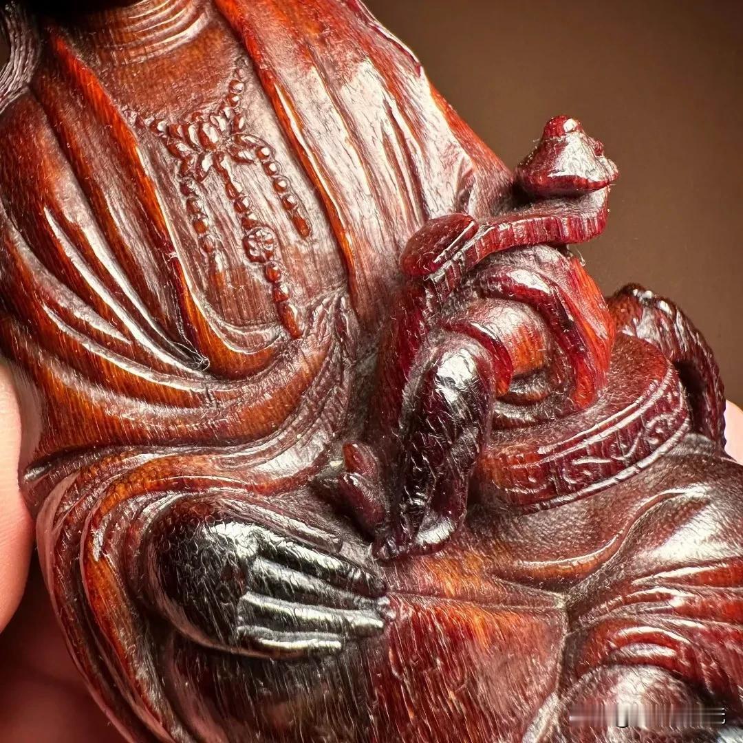 私人藏品赏析如意自在观音。品相雕工非常难得,角质呈古铜红色,开脸殊胜祥和。底部放大可见白色风化纹理和青蛙卵纹。