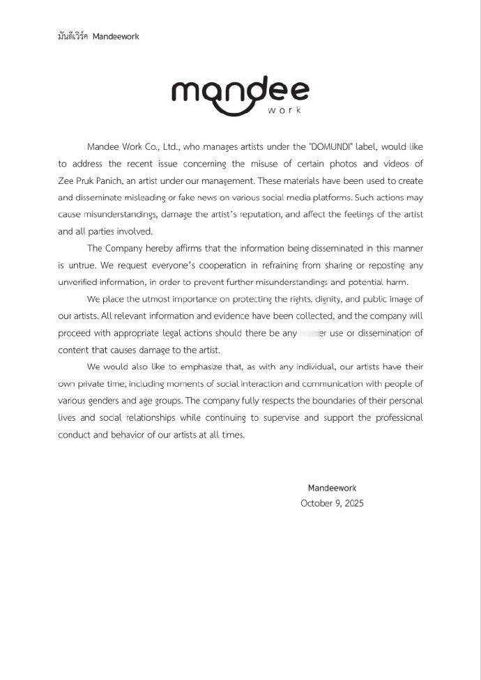 李海海公司声明 泰星李海海否认恋情后,其所属公司Mandee Work今日发布声明,指出近期社交媒体上存在滥用艺人照片与视频,制作并传播误导性不实信息的行为,已对艺人造成负面影响。声明中还强调“所有传播内容均不属实”,并呼吁各方停止传播未经证实内容,避免对艺人造成进一步误解与伤害。