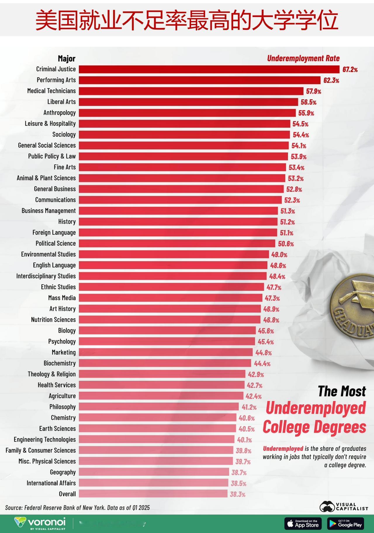 美国就业不足率最高的大学学位是什么? 如今,护理专业的毕业生就业不足率在全美范围内最低,仅为 9.7%。 就业不足率为就业市场提供了更细致的分析维度,它反映了毕业生中从事那些通常无需学位的工作的比例。从数据来看,在近 20 个专业中,2025年的就业不足率超过了 50%。 下面图表展示了美国就业不足率最高的几个专业类别,数据来源于纽约联邦储备银行。 ——2025 年就业不足:大学毕业生将面临严峻的就业市场形势 正如我们所见,刑事司法专业的毕业生整体的就业不足率最高,达到了 67.2%。 造成这一比例如此之高的主要原因在于,执法和私人安保领域的工作通常不需要大学学历。而且,要获得中央情报局或联邦调查局的工作机会竞争非常激烈,通常还需要多年的专业工作经验。 表演艺术(63.2%)和医疗技术员(57.9%)的学位排名紧随其后,呈现出相似的趋势。例如,心血管技术员通常只需要拥有副学士学位即可。 有趣的是,通用商务专业的就业不足率为 52.8%,远高于会计专业(17.9%)、数学专业(24.3%)和商业分析专业(27.2%)。这表明目前金融行业对专业学位的需求更为旺盛。
