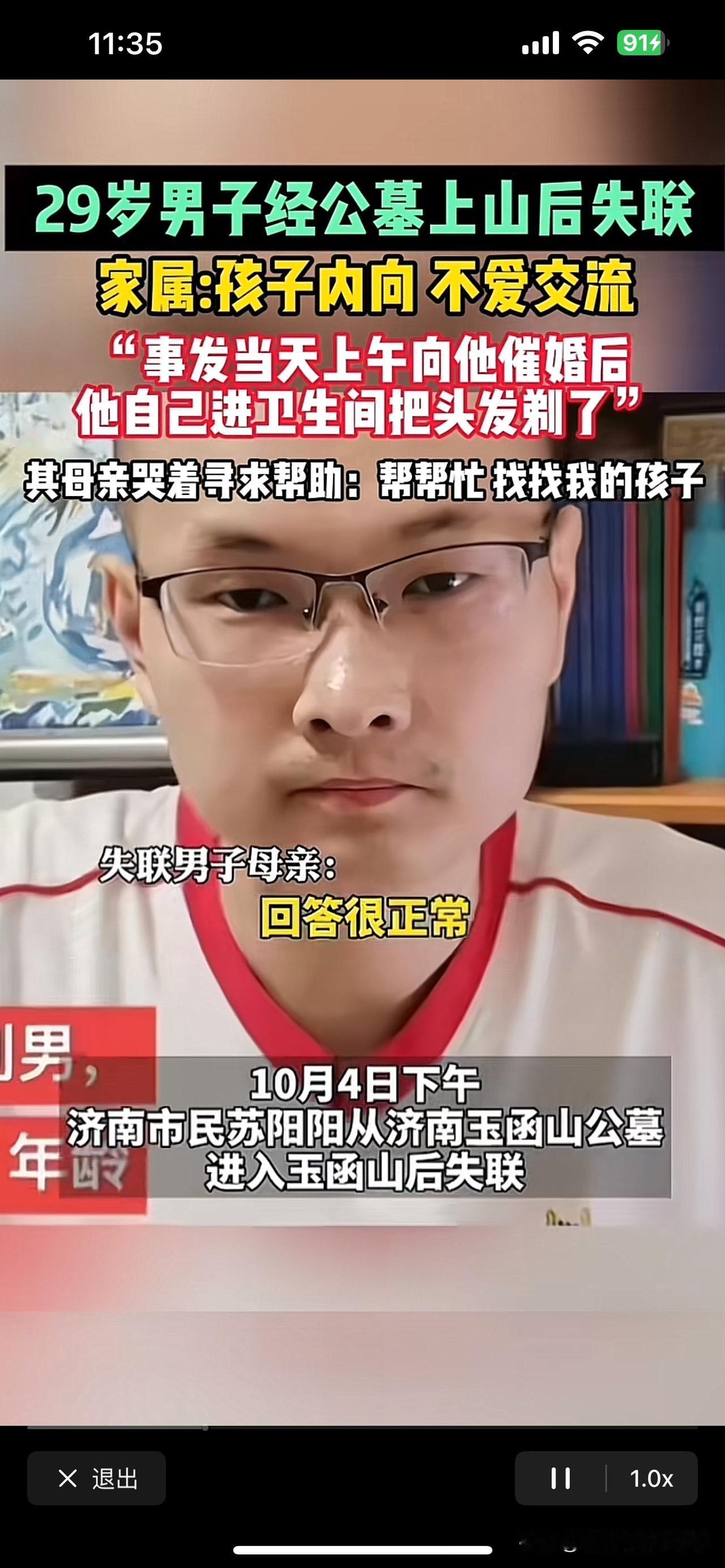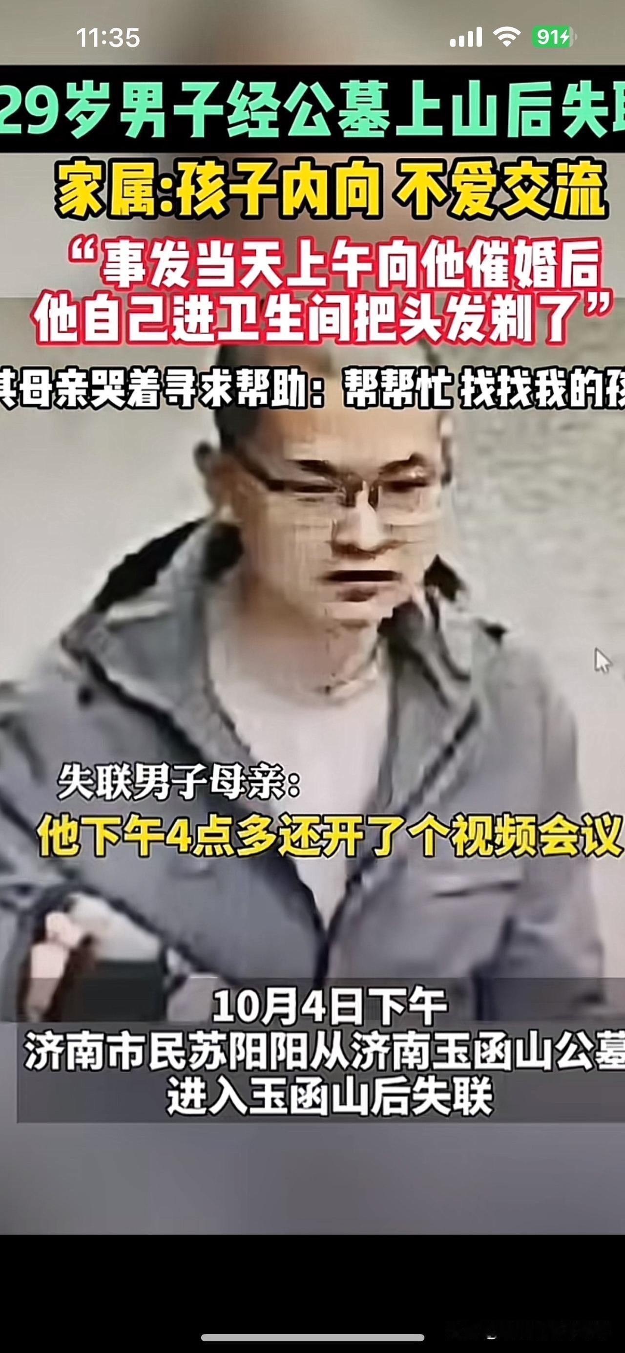 揪心啊,济南二十九岁男孩上山后失联4天了,至今没有任何消息, 而他的家人的回应让我们感觉到他的失联或许没有那么简单焦急万分的母亲说,事发前曾向他催婚,因为头发长得长,要带他去理发,而他 自己躲进卫生间把头发剃了。失联的男子叫苏阳阳,29岁,济南人,身高有一米八五,戴眼镜儿,不善言辞! 可从10月4号下午。进入济南玉函山之后,就再也没有出来。当天中午他从家里出发,骑着电动车前往玉函山公墓。监控显示,13:18左右,他进入了玉函山的景区深处,随后在一处偏僻地带弃车上山。他为什么要这么做呢?。母亲说,失联的当天上午,因为他头发长,看着不精神,想带她去理发,他也不想去,并且不愿和母亲说话 把头发剃光那天上午,还因为年纪大了该成家的话题家人催了婚。平时父母这样一句句唠叨,可能他心烦,本来就不善言谈,男孩感到了压力,母亲却没发现,这几天,警方、消防、救援队一直在山里寻找,就像石沉大海一样没有一点信息 每一个成年人都是会被琐碎压垮,也许他只是想找一个角落躲一躲,只是想上山安静一下喘口气。希望男孩看到父母的良苦用心,回家吧,妈妈已经快疯了,希望这个妈妈看到孩子回家后也顺其自然吧大环境如此,不要过多的干扰,儿孙自有儿孙福[祈祷][祈祷][祈祷][祈祷][祈祷]