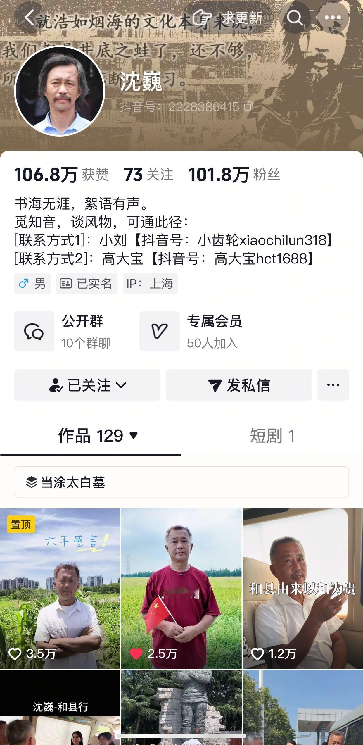 沈巍今天更新主页:书海无涯,絮语有声。觅知音,谈风物,可通过助理小刘和前任司机高大宝联系到他。 由此可见,虽然沈巍嘴上天天说不想壮大,但是动作还是朝着壮大的方向发展[我想静静] 这也可以理解,沈巍即便不想挣钱,也要为他身边这些人着想,挣点钱,让大家都有点钱[比心]