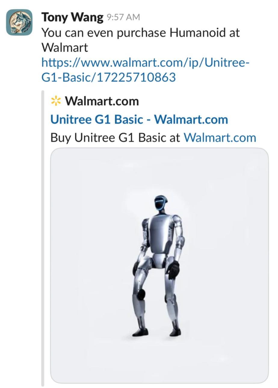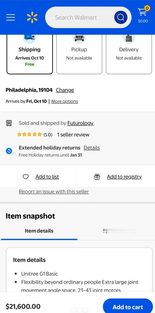 中国的人形机器人,已经走上美国超市货架了。宇树G1在沃尔玛官网开卖,售价2